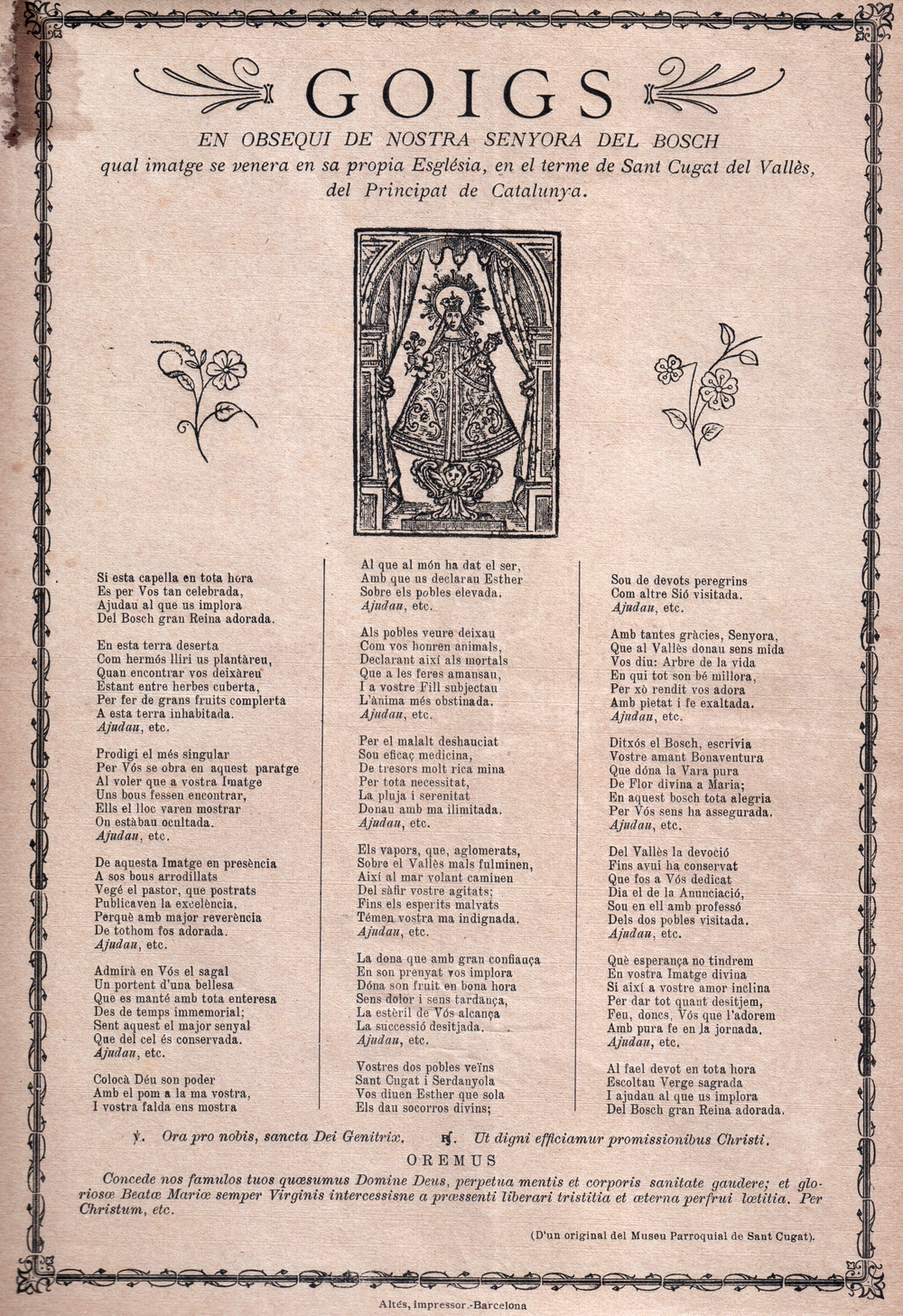 Goigs dedicats a la Mare de Déu del Bosc que es venerava a la capella homònima, també anomenada de Sant Adjutori.