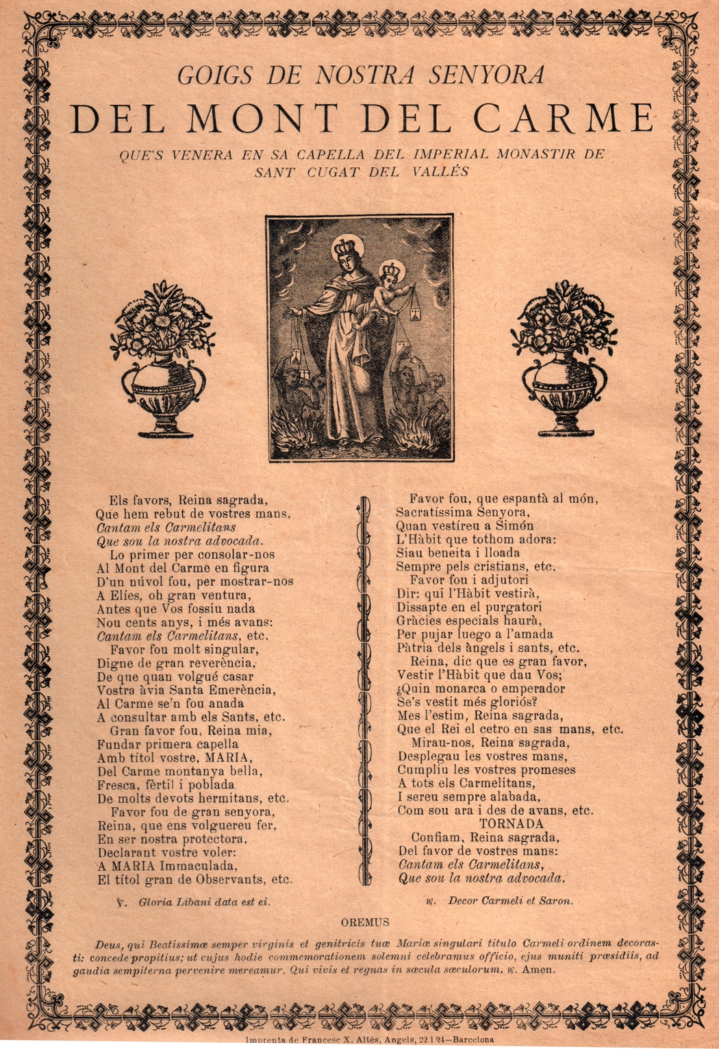Goigs dedicats a la Mare de Déu del Carme que es cantaven en una capella de l'església del Monestir de Sant Cugat. En aquest cas, es tracta d'una lletra genèrica d'aquesta advocació mariana: