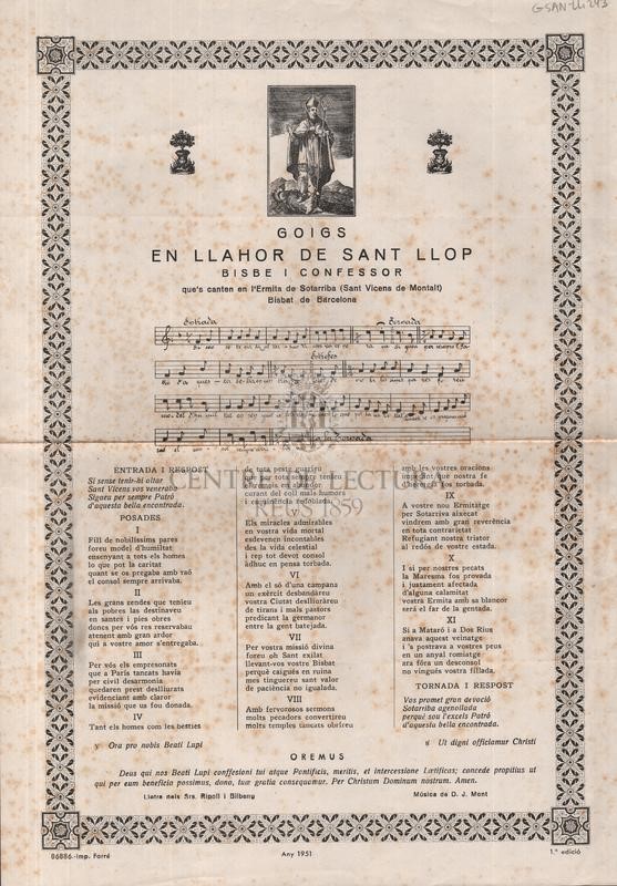 Goigs que es canten en honor a sant Llop, a l'ermita homònima de Sant Vicenç de Montalt. L'exemplar que mostrem es tracta d'una primera edició editada per la Impremta Farrer, en blanc i negre, en paper corrent, sense numerar, de 29x41,5 cm. Quadre delimitat per una orla xilogràfica estreta de motius geomètrics.