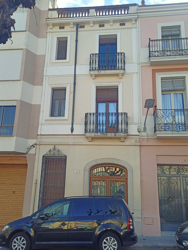 A la planta baixa s'hi troba el portal amb arc rebaixat, situat a la dreta de la façana, i al costat esquerre hi ha una finestra amb reixa de ferro forjat. El primer i el segon pis tenen una configuració quasi idèntica, però les obertures es fan més petites a mesura que es puja de planta. A totes dues plantes, hi ha balcons amb llosanes de pedra motllurada sustentades per mènsules i baranes de ferro de fosa. Tots els marcs de finestres estan decorats amb motllures.
