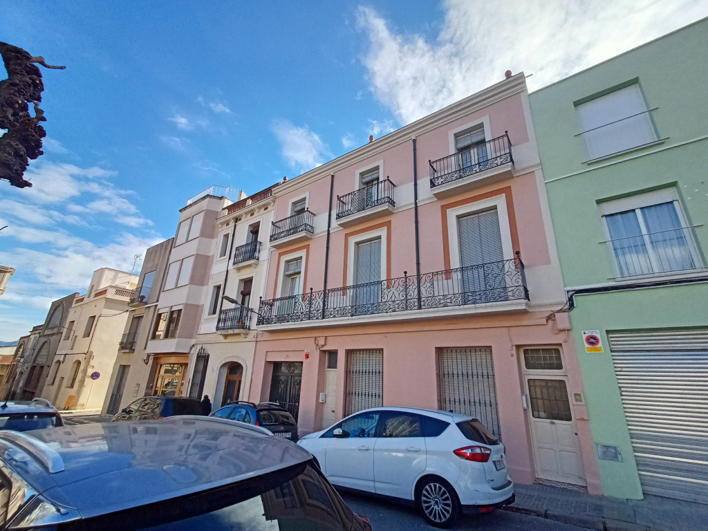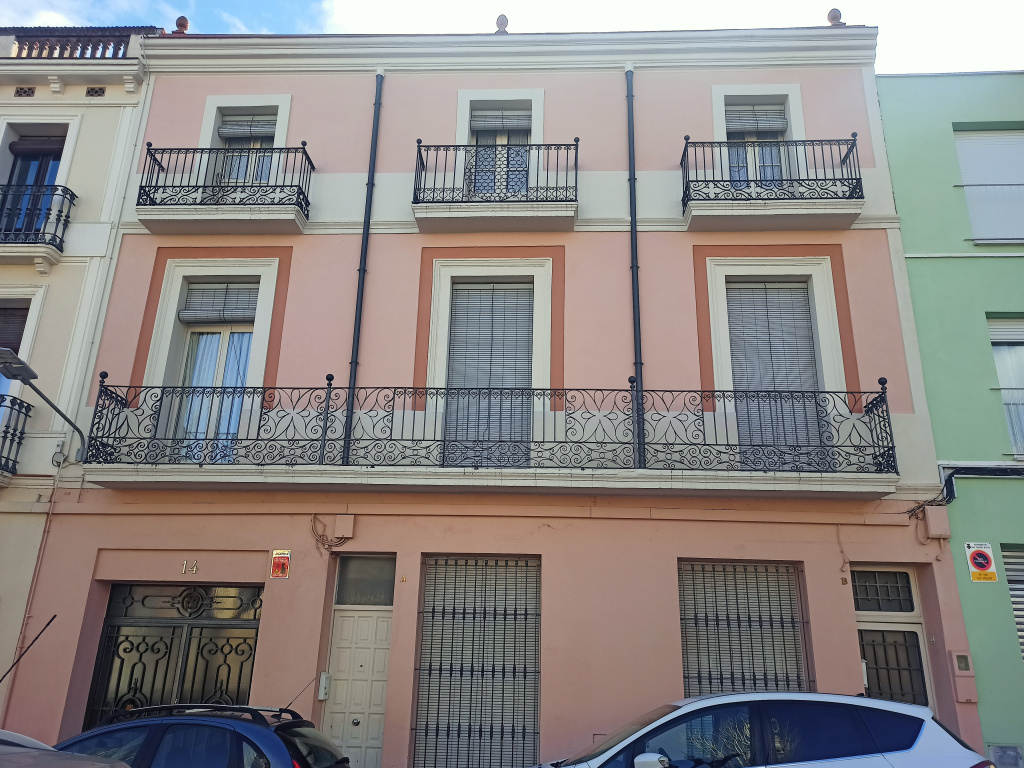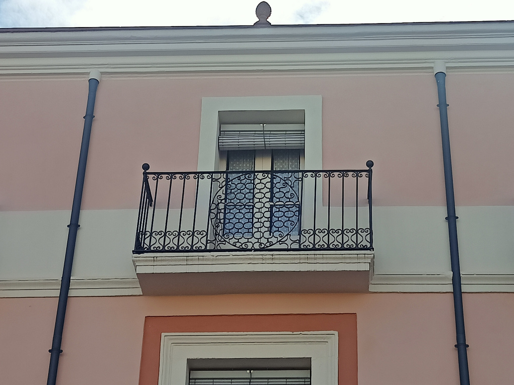 El primer pis o planta principal presenta tres grans obertures idèntiques que donen accés a una balconada, amb llosanes motllurades i una barana de ferro, que presenta motius decoratius florals i geomètrics. Les obertures estan emmarcades per simples motllures.