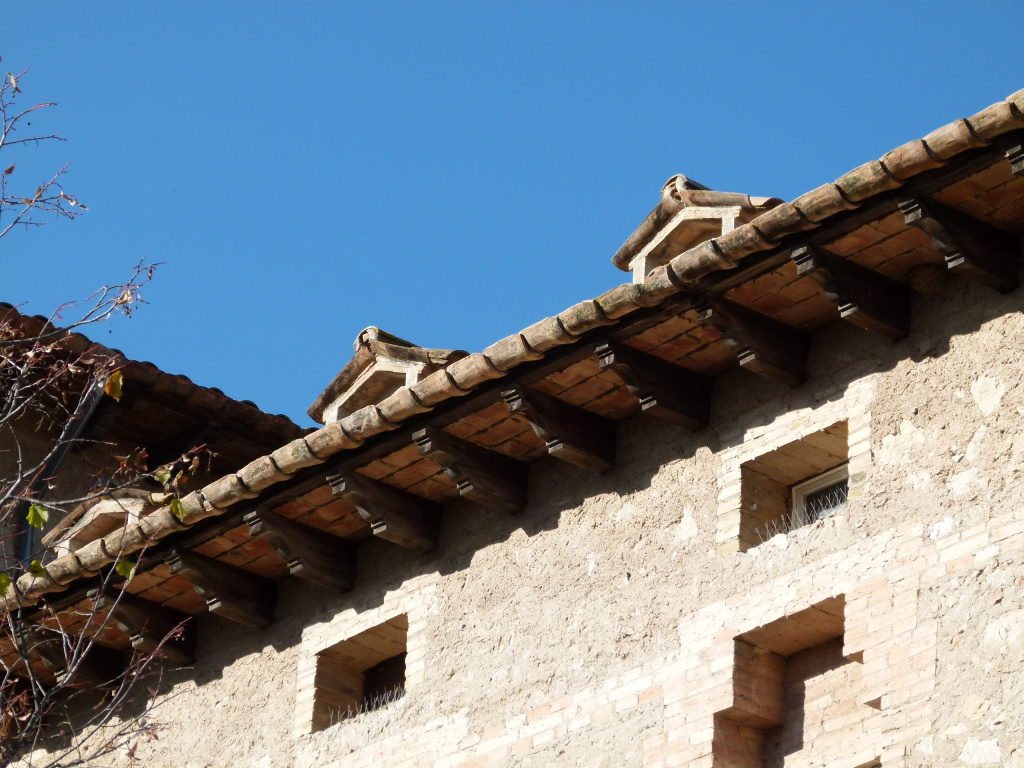 Les obertures, tants finestres com portes, es caracteritzen per les llindes esglaonades, en unes façanes de composició simètrica fornades per ràfec de biguetes de fusta.
