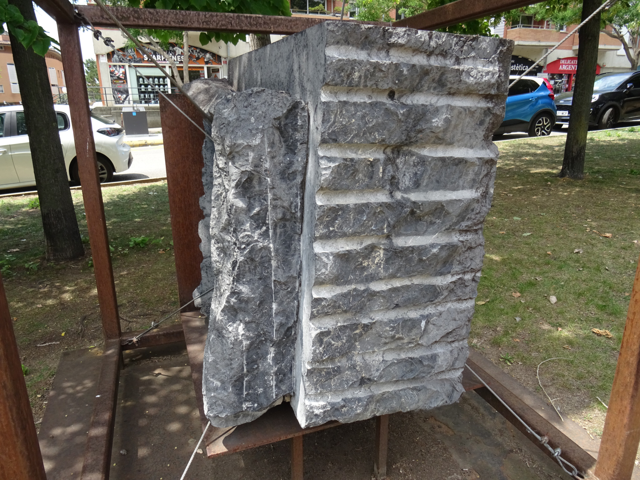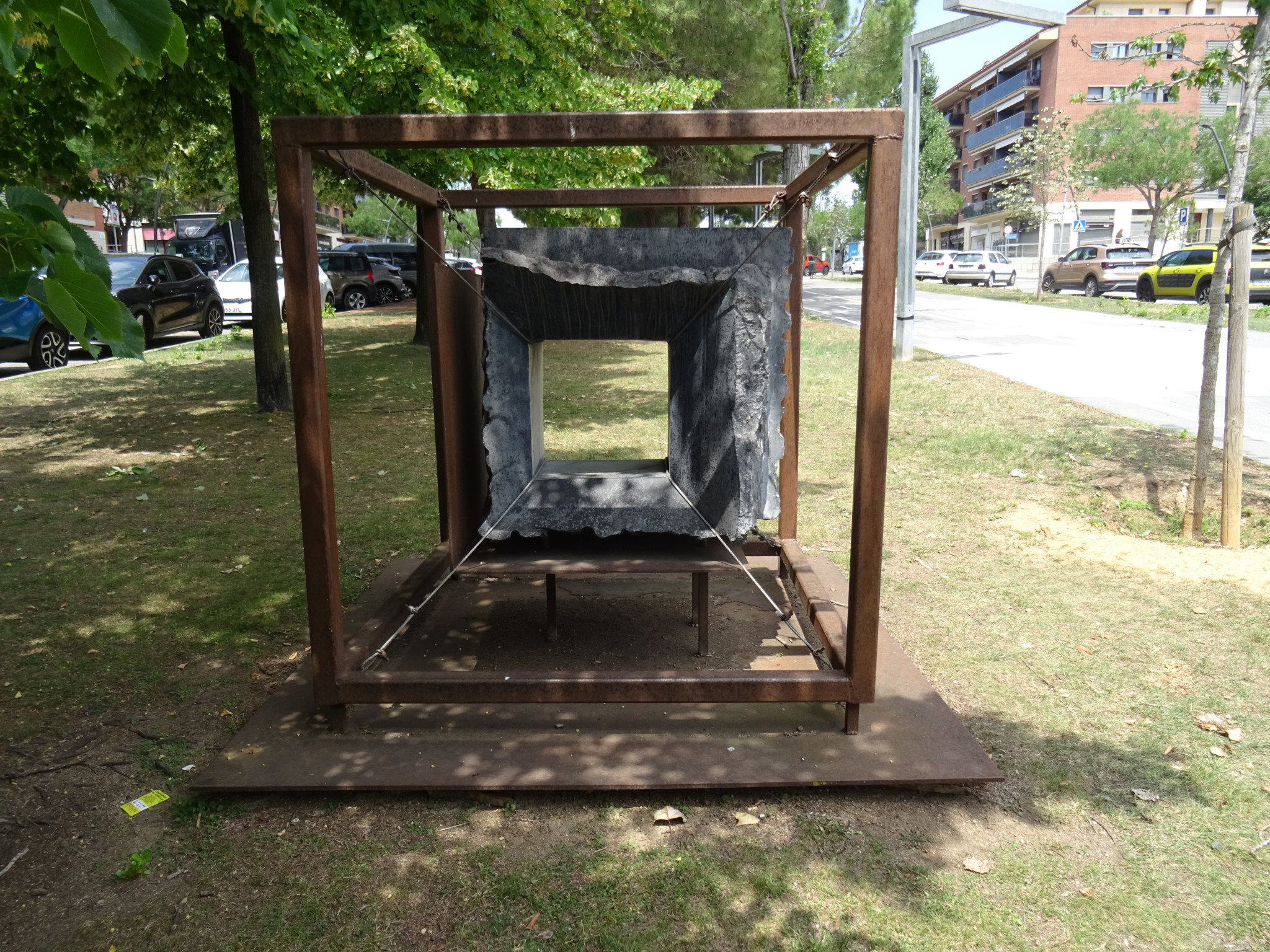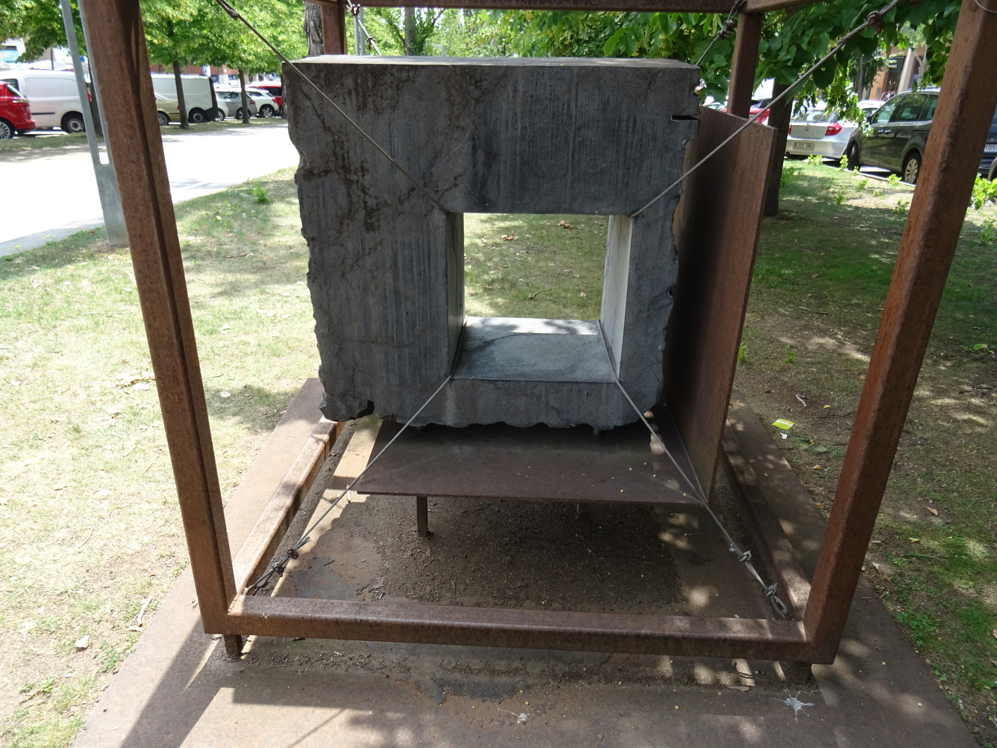 Monument que representa el gènere literari del teatre i que mesura 150 x 150 x 160 centímetres, fet amb pedra marquina i ferro. L'element escultòric és un cub de ferro, fet amb perfils. A diferència de les altres escultures que estan formades per dos cubs, aquí només n'hi ha un. Dins del cub, al centre, hi ha una pedra treballada en part, que està subjectada amb uns tensors i per la part inferior ancorada a una planxa de ferro.