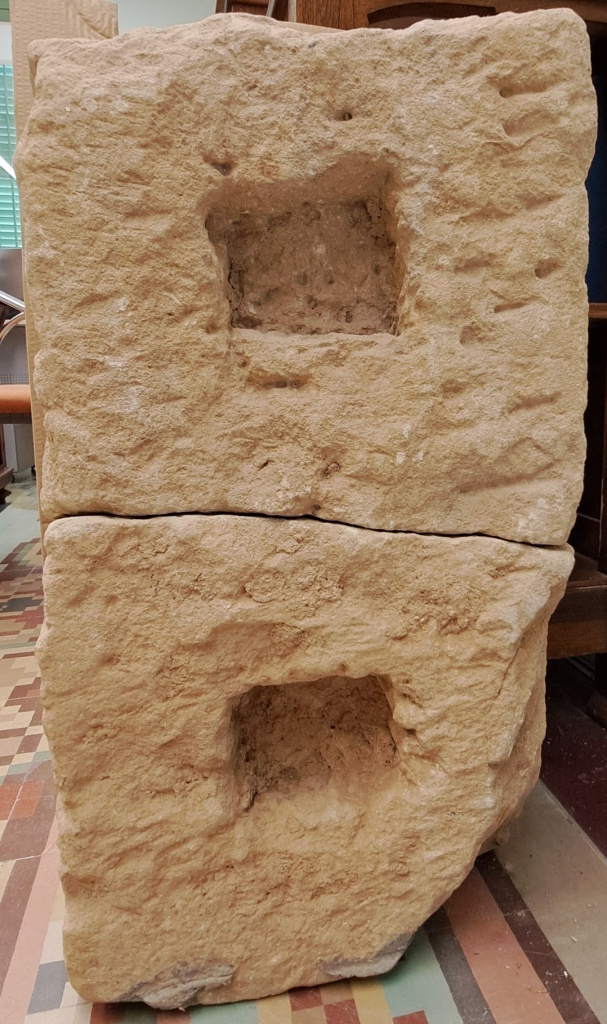 A la part posterior de la làpida, s'hi poden observar dos forats que es van fer durant la seva reutilització a l'habitatge baix-imperial.