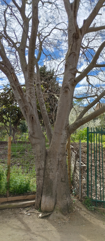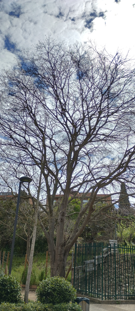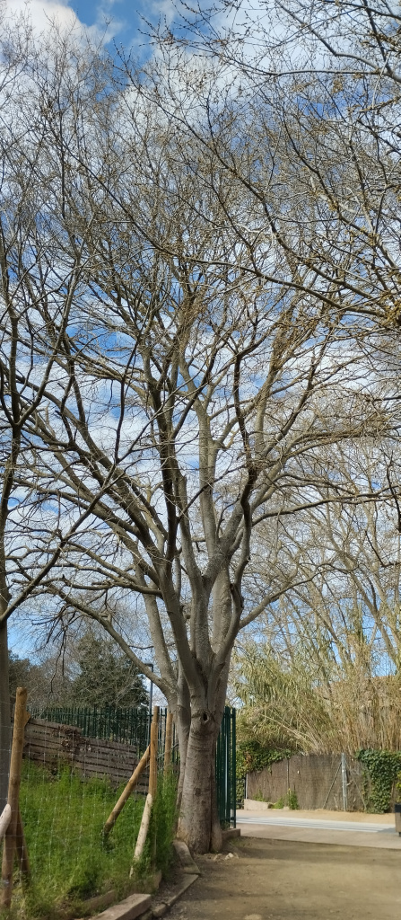 De la família de les ulmàcies, es caracteritza per una capçada esfèrica i ampla. Les branques són erectes, primes i flexibles i el tronc, de tres soques, es presenta recte amb una escorça llisa de color gris plom blanquinós.