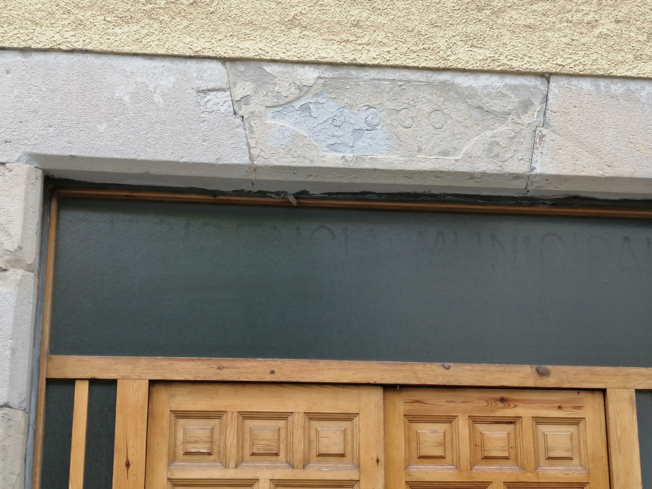 Dates situades en diverses portes que mostren l'evolució de l'edifici segons les notícies històriques. Cal destacar que una mica més amunt de la segona hi ha com una mena de buit provocat per l'arrencament d'una rajola, pedra.. on hi ha encara restes de l'antic enlluït de calç amb les inscripcions de "RTA DEU HERN..i un tros de data de ..71" que segurament seria 1871 corresponent amb l'acabament de les obres o similars. Estpa alterat per la subjecció d'altres elements sobreposats.