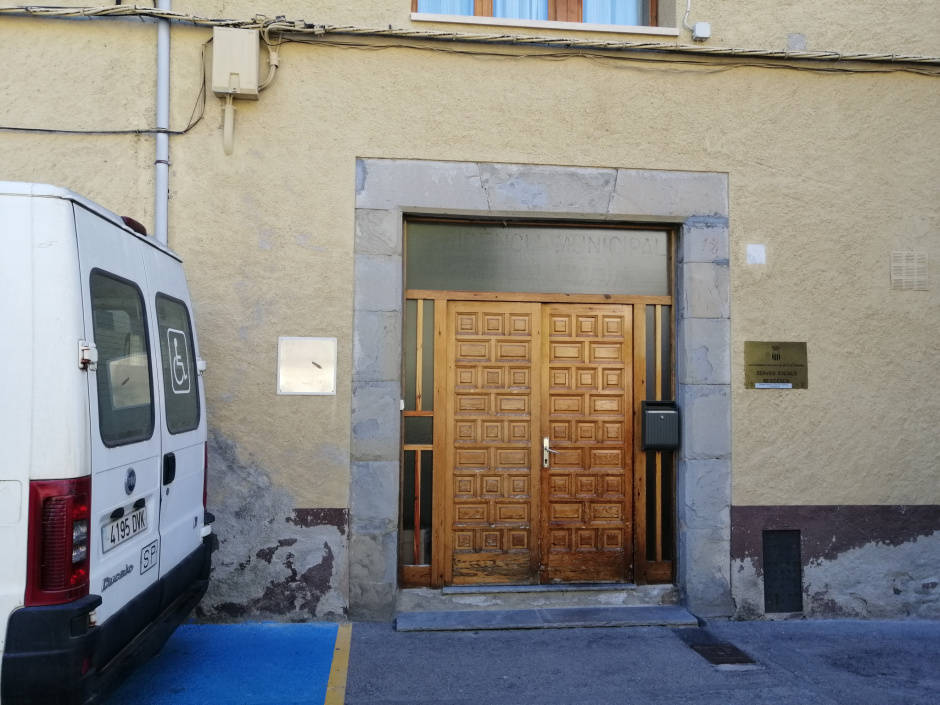 Conjunt de dues llindes situades damunt de les dues portes que donen accés a les diverses dependències de l'edifici. La primera i situada al denominat "hospital vell" correspon amb una porta coronada amb llinda de pedra amb els muntants de pedra calcària de tipus bisellat i la llinda recta situada al seu damunt i on hi ha incisa la data de 1774 corresponent amb una de les reformes del vell hospital gremial i situada a sota d'un cercle on hi ha inserida una creu de malta. L'altre porta i situada a l'ala de més a tramuntana es correspon amb les reformes del vell hospital gremial com a escola. Aquestes obres van ser iniciades l'any 1860 per ordre del rector Sebastià Rovira i Rovira i degut a la seva mort sobtada van ser finalitzades per la família Escarrà i Guixà. Es tracta d'una obertura d'unes dimensions més grosses que l'anterior i de factura també allindada i realitzada en pedra calcària. Està composta per tres peces de pedra encaixades i a la central i en forma de clau hi té inscrita la data de 1860 dins d'un medalló i corresponent amb aquesta reforma.