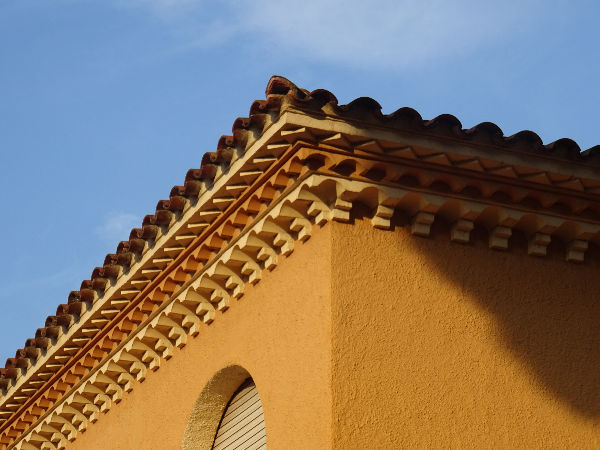 A la planta baixa hi trobem el porxo, format per arcades de punt rodó i amb coberta de volta catalana amb maó pla. El primer pis es distribueix amb una combinació simètrica de finestrals de punt rodó i balcons integrats al cos de l'edifici, amb grans obertures horitzontals. Al centre de la façana hi ha un escut on es pot llegir: "Mas Roig MCML". És fet amb ceràmica crua, i l'orla barroquejant que l'emmarca, subjectada per dos nens nus, s'inspira en l'estil barroc. Els angelets o "Putti", però, no tenen ales.