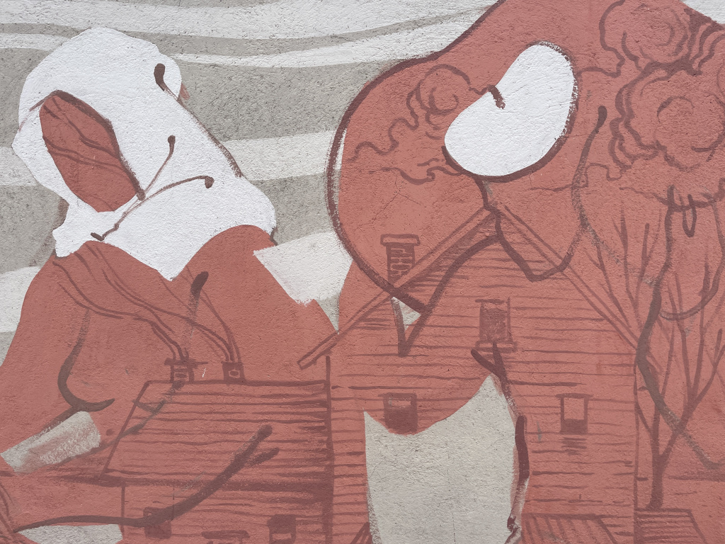Aquestes persones, representants dels exiliats que han de migrar cap a un nou país, sobre un fons gris amb línies blanques sinuoses, tenen cases dibuixades a l'interior dels seus cossos, amb línies fines i delicades, que representen les cases que van haver d'abandonar a la força.