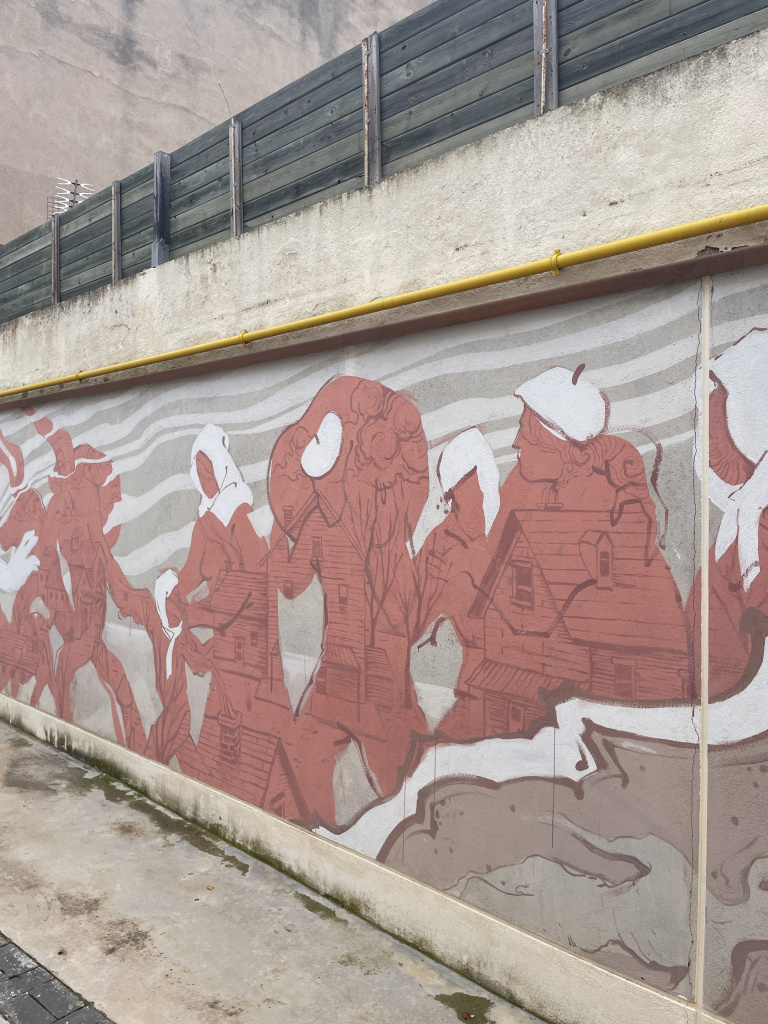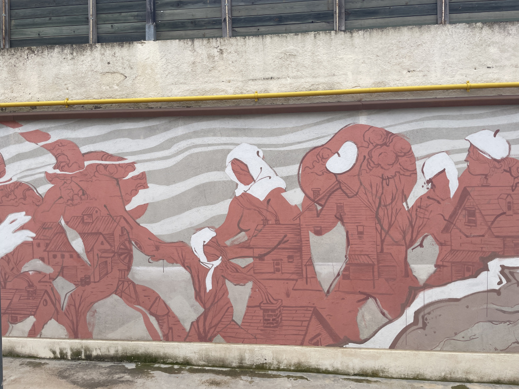 En aquest quart mural titulat "Migracions forçades", es mostra d'un color vermell viu, potent i esperançador, a un grup de persones de diferents edats i sexes que caminen cap a l'exterior i s'ajuden entre ells a fugir i sortir del terror al qual estaven sotmeses. Porten barrets o mocadors de color blanc al cap i es donen la mà o traslladen queviures.