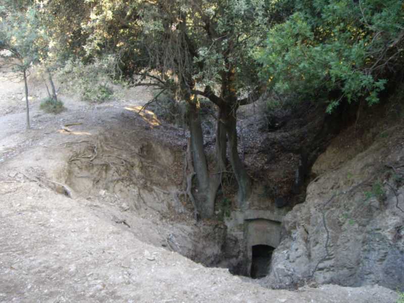 La porta d'entrada, oberta a la roca natural, està emmarcada per brancals de maó massís i coberta per un arc escarser de maons disposats a plec de llibre. Per sobre de la llinda, que actua com un arc de descàrrega, hi ha un pany de paret de maó massís coronat per un altre arc escarser de maó a plec de llibre.