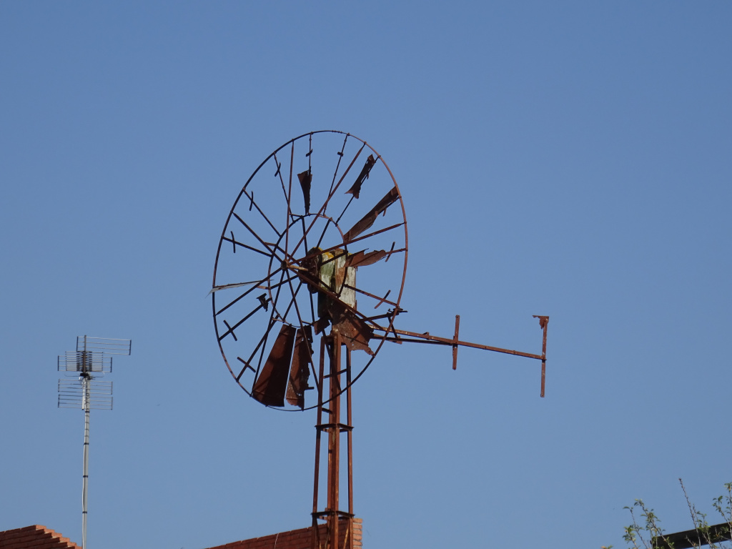 Els molins de vent van ser habituals fins a mitjans del segle XX per elevar l’aigua dels pous, que s’utilitzava per regar horts i per a usos domèstics. Van ser substituïts per bombes d’aigua elèctriques, accionades per motors de combustió o d’explosió. Aquest tipus de molins tenen una roda amb radis, com una roda de bicicleta, on s’hi adhereixen pales de planxa metàl·lica, disposades de forma guerxa per obtenir l’hèlix. El vent provoca una empenta ascensional que eleva la pala i genera el gir de l’hèlix, que va girant com un penell, segons la direcció del vent. Es col·locaven sobre una estructura d’acer, tot i que els primers molins eren de fusta.