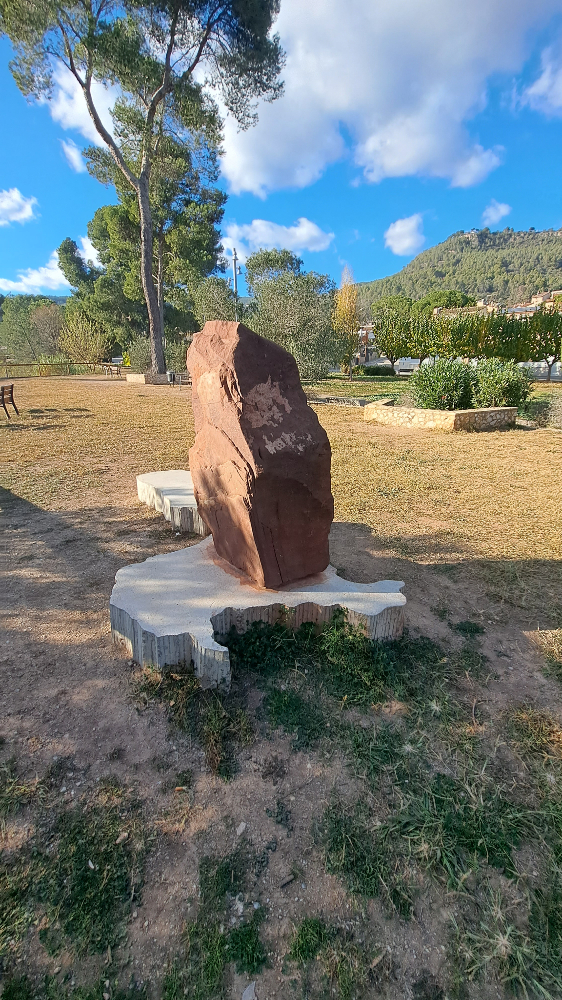 És un monòlit aïllat, de pedra sorrenca vermella sense desbastar, amb forma triangular. Es troba a sobre d'una base de formigó blanc que representa el terme municipal del municipi. Al frontal hi ha una placa d'acer patinable amb la següent llegenda: