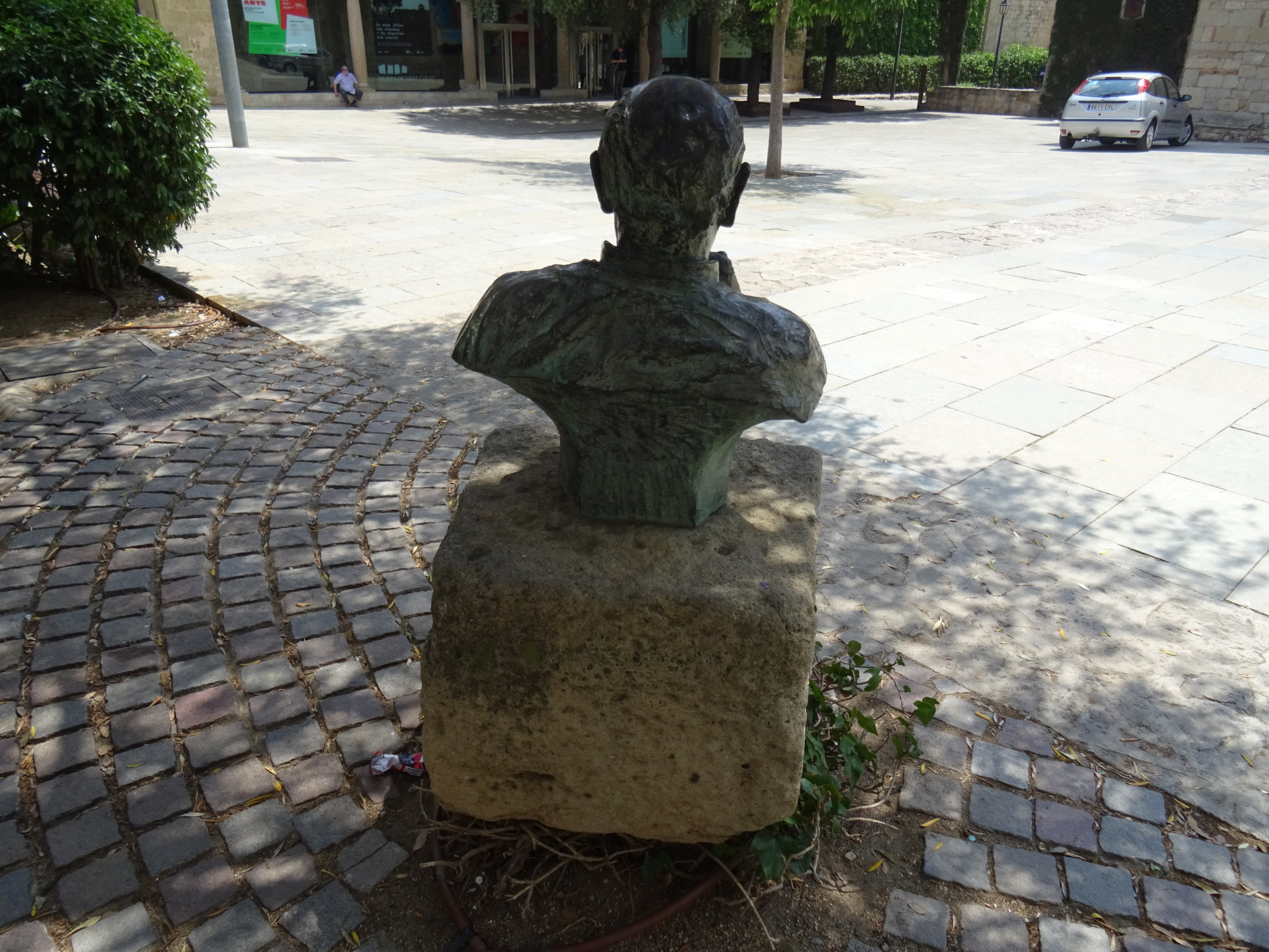 Monument dedicat a Miquel Cabanas Alibau, que parteix del retrat que li va fer el seu fill Frederic Cabanas Castells el 1987. És un bust de bronze que se sustenta damunt d'una pedra irregular, que fa de pedestal. L'any 1995, Ramon Millet va fer el motlle de guix que va servir per crear l'escultura en bronze a la fundació Vila. Les mides del bust són 51 x 37 x 62 cm. La peanya de pedra del monestir, mesura 63 x 75 x 45 cm.