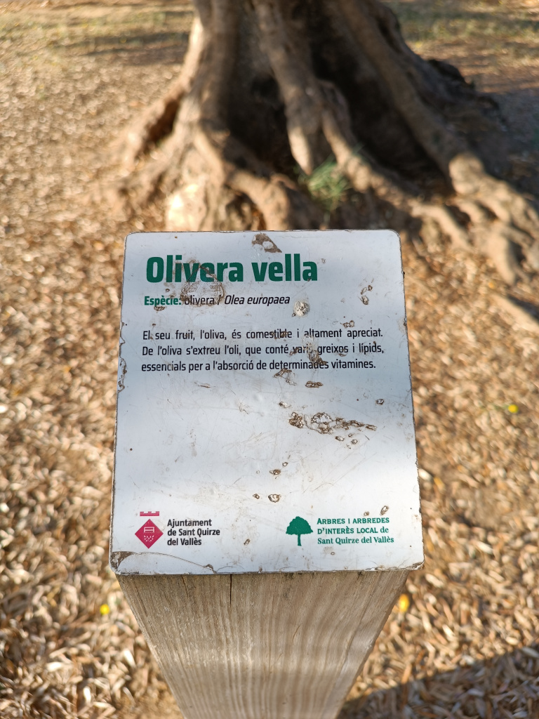 L'arbre està senyalitzat amb un post de fusta i un petit cartell informatiu.