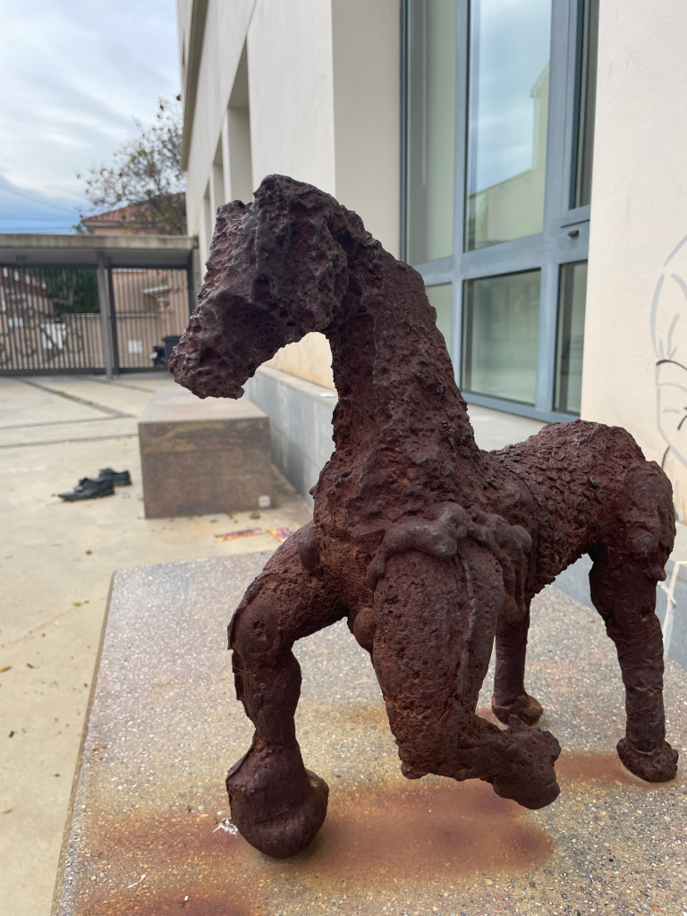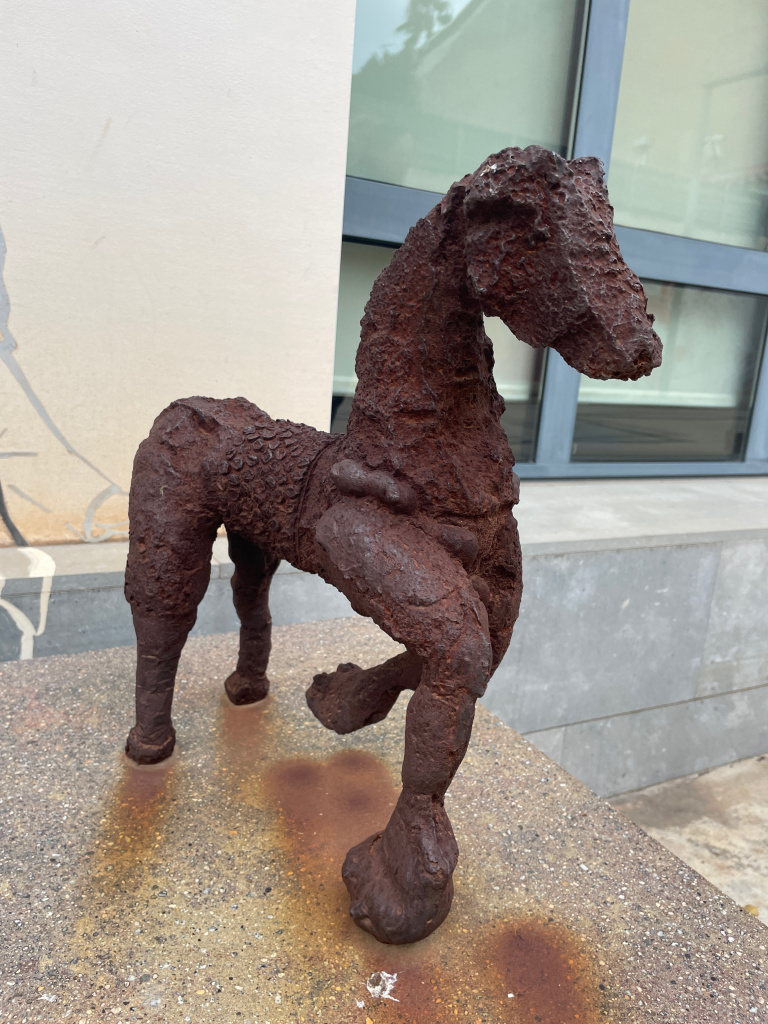 Cavallet de ferro fos amb unes mides de 40 x 35 x 22 cm. L’escultura, que representa una joguina infantil, presenta un aspecte dur, robust, rovellat, res a veure amb el que seria un element de joc pels infants.