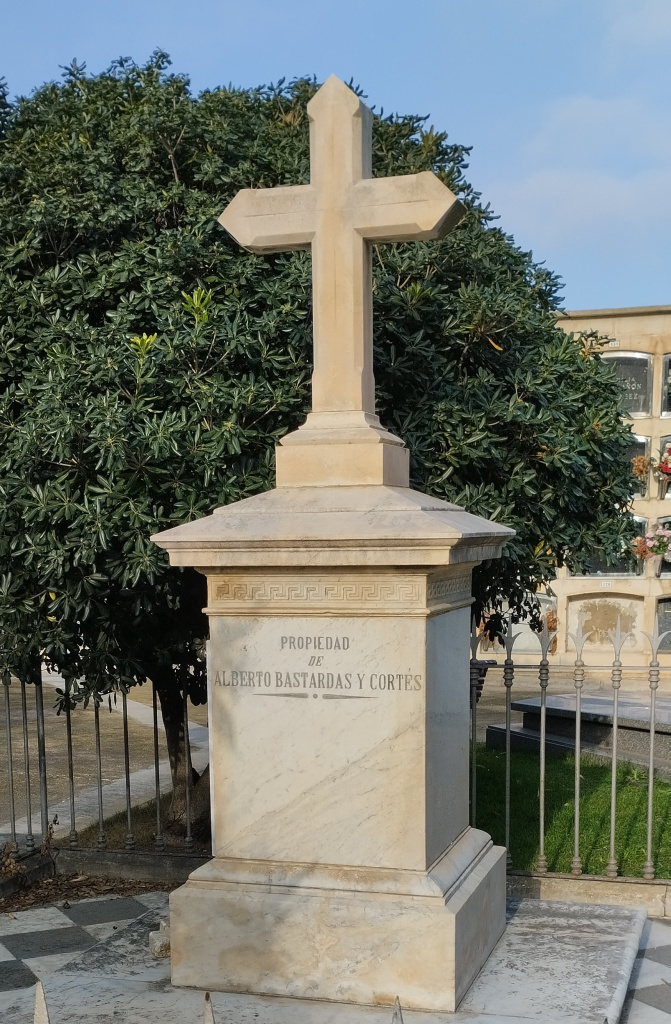 Presidint el panteó destaca un pedestal cúbic sobre un podi de molt poca alçada, amb una base motllurada i un coronament piramidal sobre el qual es disposa una creu llatina de pedra. El perímetre de l'extrem superior del pedestal queda decorat per una sanefa de greques, per sota de la qual figura gravada la inscripció "PROPIEDAD DE ALBERTO BASTARDAS Y CORTÉS".