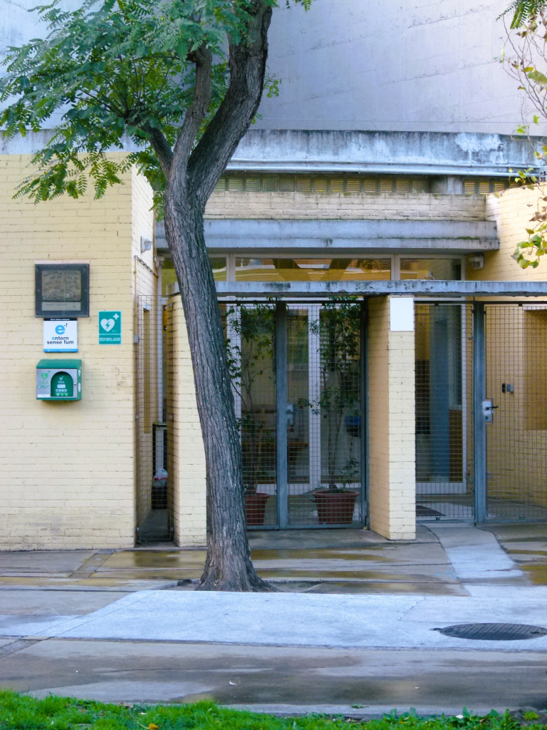 De forma rectangular està elaborat en fang refractari cuit a 1250 °C i decorat amb argiles, amb unes dimensions aproximades de 42 x 30 cm. Està instal·lat a la porta d’entrada del centre cívic Salvador Espriu protegit per un vidre.
