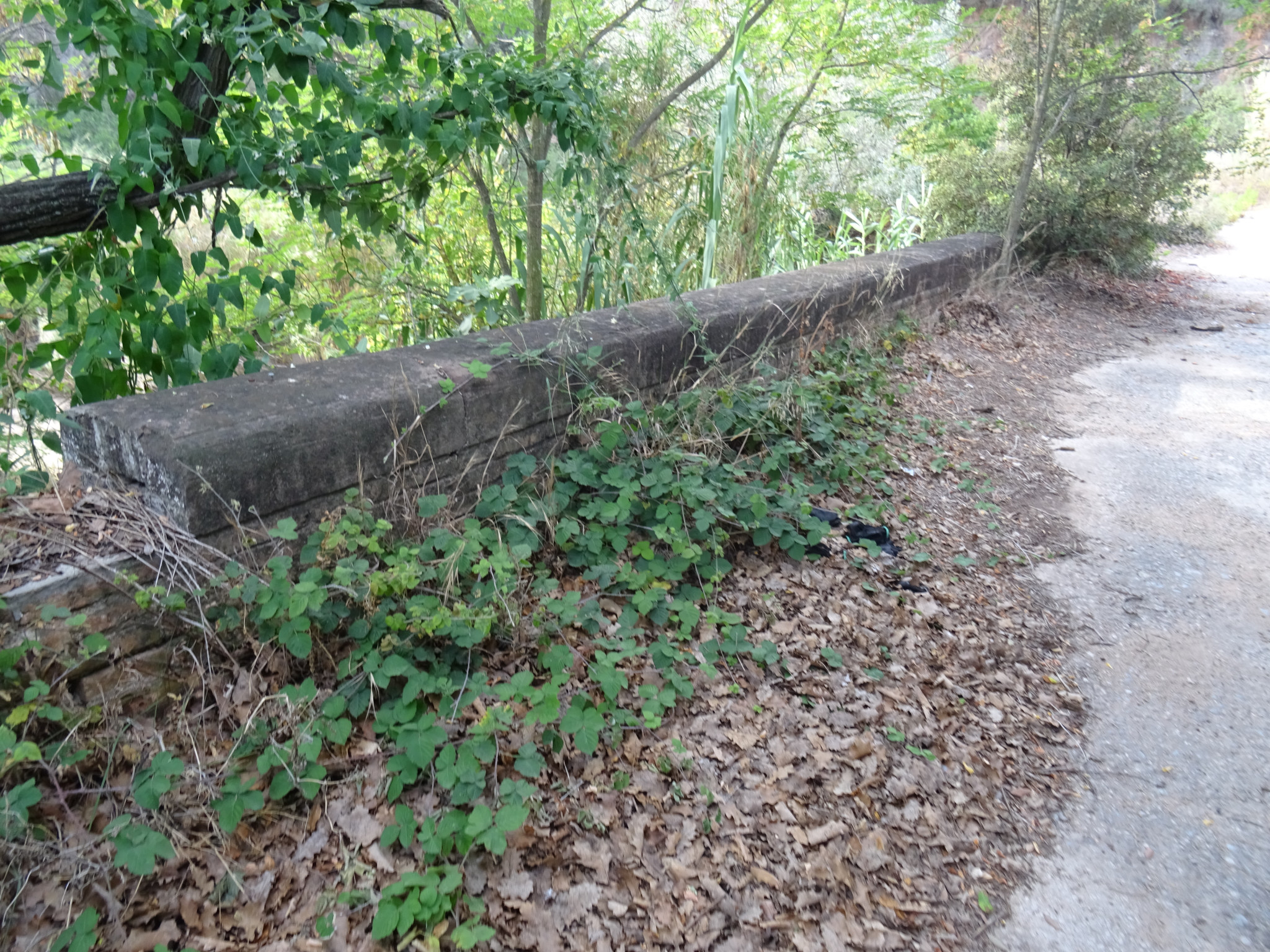 Molt a prop, a la riba esquerra de la riera, hi ha un mur de contenció amb bancades alternes, fet amb paredat comú, que servia per evitar la caiguda de vehicles.