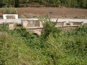 Pont d'un sol ull en forma de mitja circumferència fet amb carreus de pedra regulars i lligats amb ciment. Per la seva vessant septentrional fa 5 m de longitud a la part més baixa i 2 m a la part elevada. Per la cara sud fa 7,5 m de longitud. Té una amplada de 6 m, mentre que l'altitud no es pot apreciar degut a la gran quantitat de vegetació. Als laterals de la superfície, just al costat de l'enquitranat recent, hi ha uns murs de contenció fets de carreus regulars de pedra lligats amb ciment, recoberts de totxanes en els laterals. N'hi ha 3 que tenen 1,5 m de llarg x 50 cm d'alt x 30 cm d'ample; i en tenim dos just a sobre de l'ull del pont, de 1,5 m de longitud x 80 cm d'alt x 30 cm d'ample. A la cara nord hi ha tan sols aquest mur més alt mentre que a la cara sud hi ha dos murs més reduïts a llevant del mur més gran i un de reduït a ponent. La volta de l'ull del pont està feta exclusivament amb ciment.