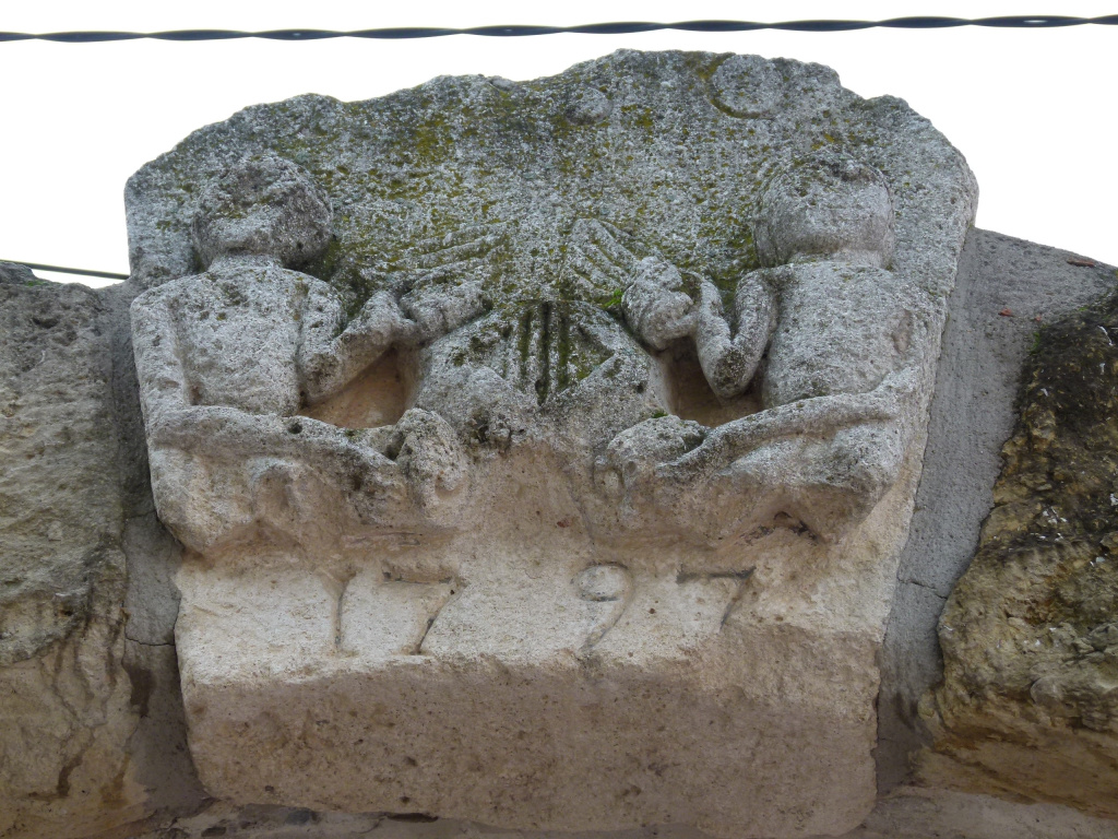 La imatge actual de l’arc no sembla tenir el mateix radi de curvatura que l’original, a jutjar per la comparança amb imatges antigues del portal. La dovella central destaca per tenir una inscripció, on s’aprecia molt bé la data de 1797 a la part baixa, i és molt més degradada i il·legible la data de la part superior, de 1650. Entre les dues dates hi ha dues figures decoratives en baix relleu, possiblement angelets, enmig dels qual es veu l’escut caironat amb els quatre pals (escut municipal del segle XVII), al seu interior, i envoltades d’una orla que sustenten les mans de les figures.