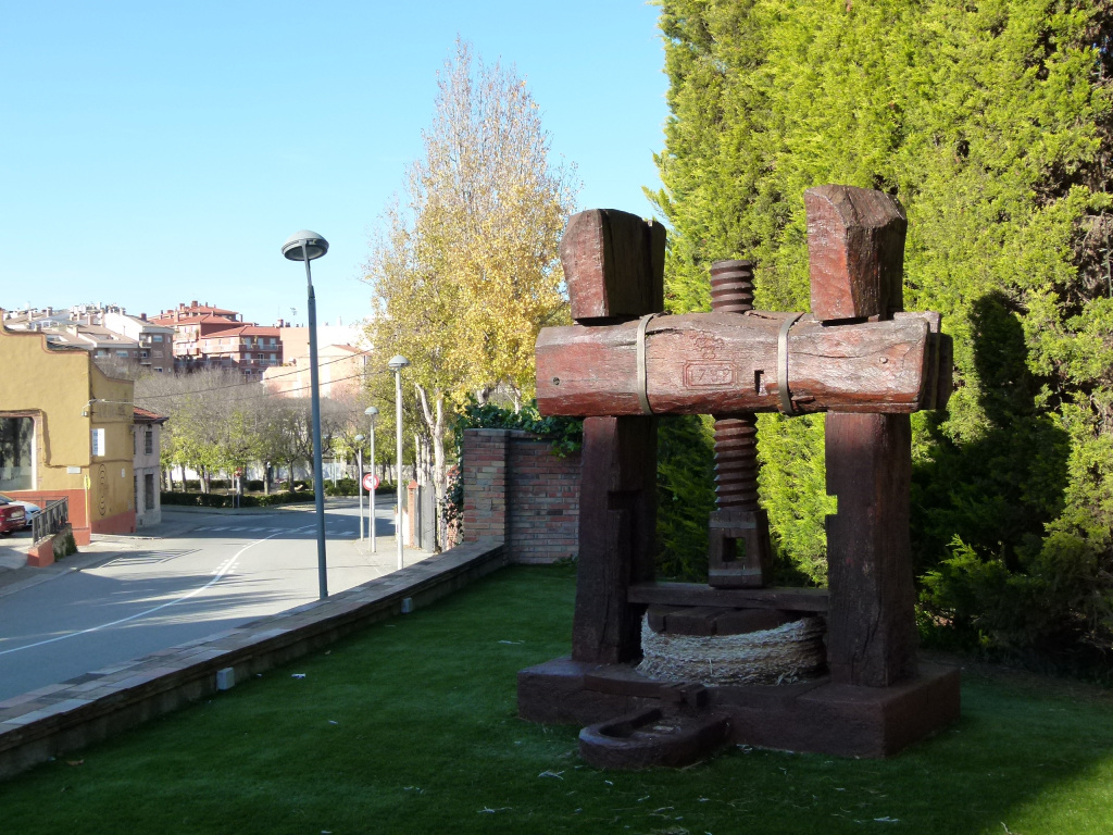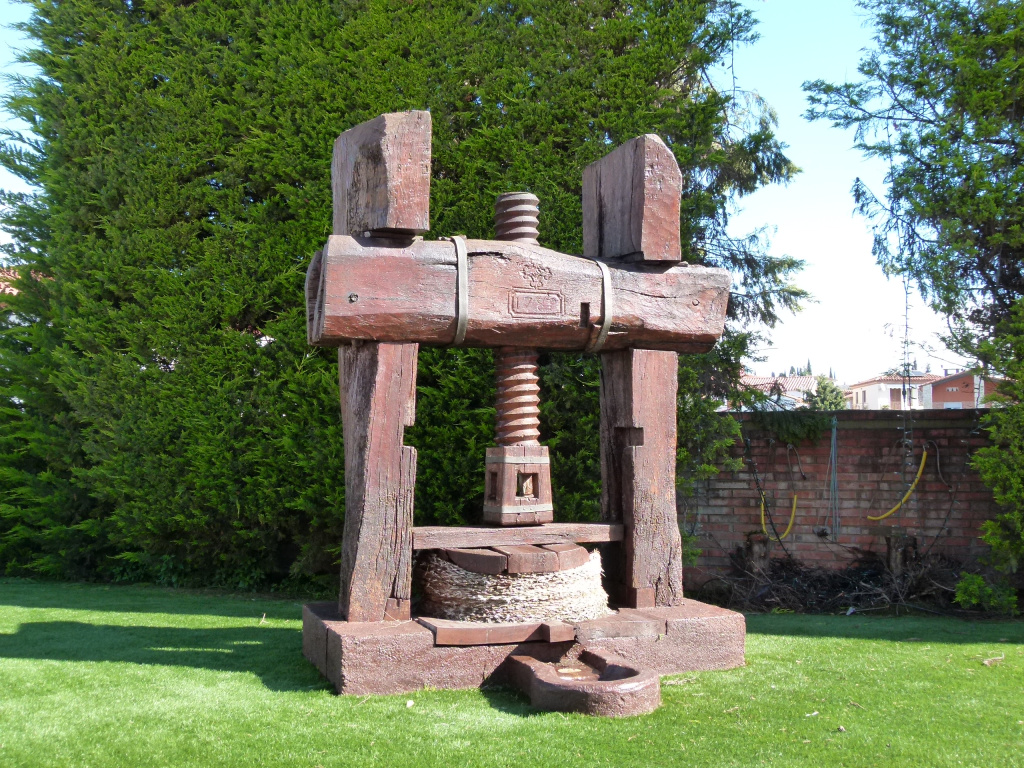 Premsa de cargol feta completament de fusta, amb un plat de premsa (no sembla original), una petita cubeta de decantació a la part davantera, dos muntants i un travesser superior de grans dimensions, cargol, femella i barret.