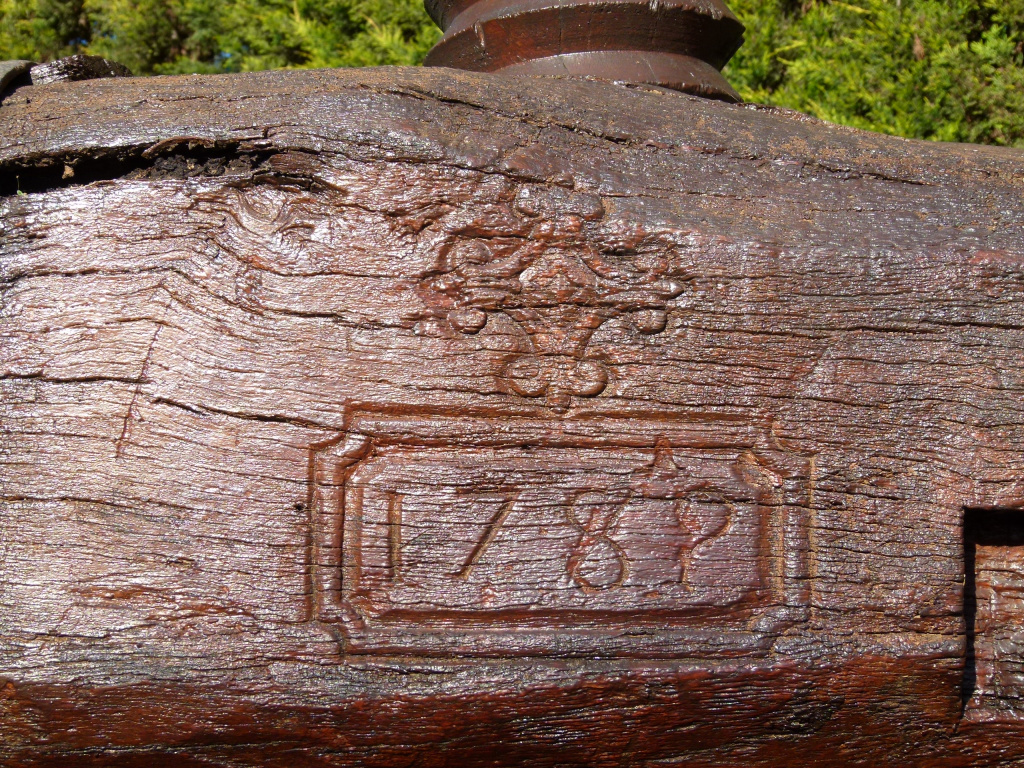 No conserva la barra o el sistema de tracció. A la part central del banc o travesser podem veure gravada a la fusta la data de "1788", emmarcada i amb una insígnia en forma de creu decorativa a la part superior.