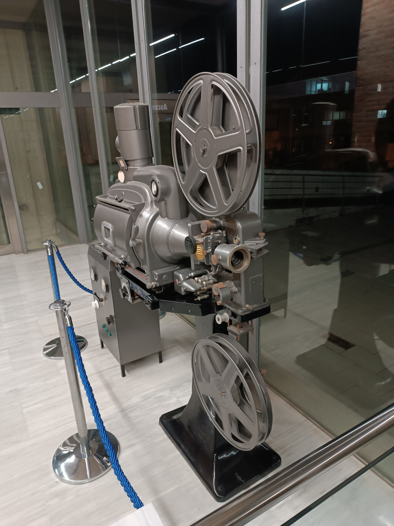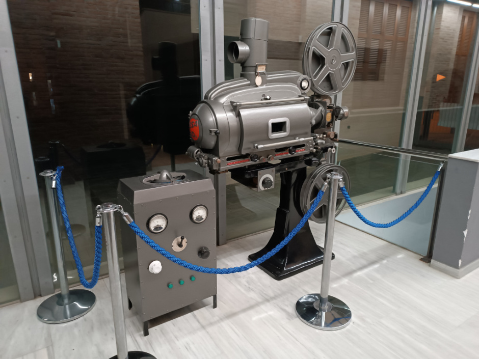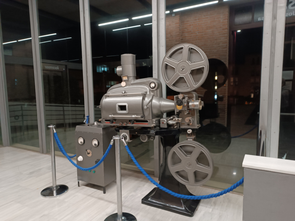 Projector cinematogràfic de la marca OSSA, actualment exposat al vestíbul d’accés de la Patronal. El dispositiu era utilitzat per mostrar pel·lícules cinematogràfiques sonores de 35mm. La màquina està formada per un peu o base de suport, la làmpada, les lents de projecció, dues bobines i el visor. A part, també hi ha l’equip de so amb amplificador i altaveu. A la part de darrera de la càmera hi veiem una circumferència de color vermell amb la marca gravada: OSSA 60A.