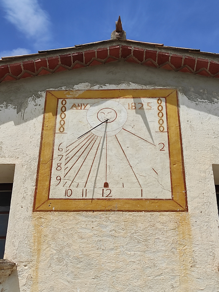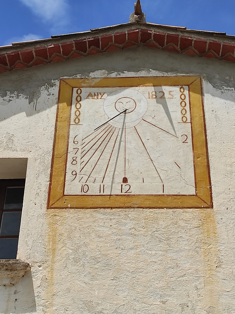Disposa de línies horàries, marques de les mitges hores i la numeració aràbiga marca de les sis del matí a les dues de la tarda. A la capçalera hi podem llegir la datació, "ANY 1825".