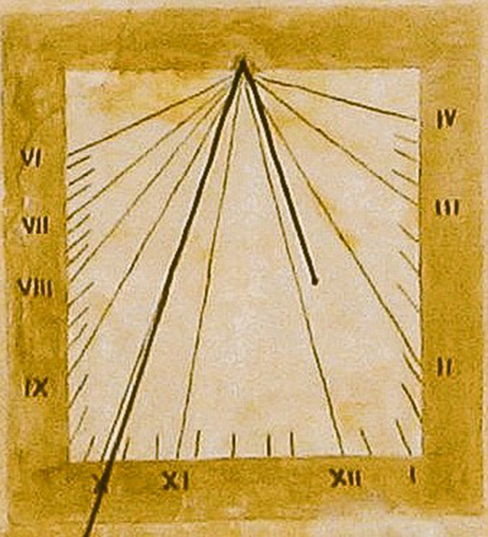 En la imatge polaritzada, s'observen les restes d'un antic rellotge i en més detall, de l'astre solar disposat al voltant del gnòmon. A l'any 1985 el rellotge estava molt esborrat i és molt probable que hi hagi algunes errades en la reproducció i pintat.