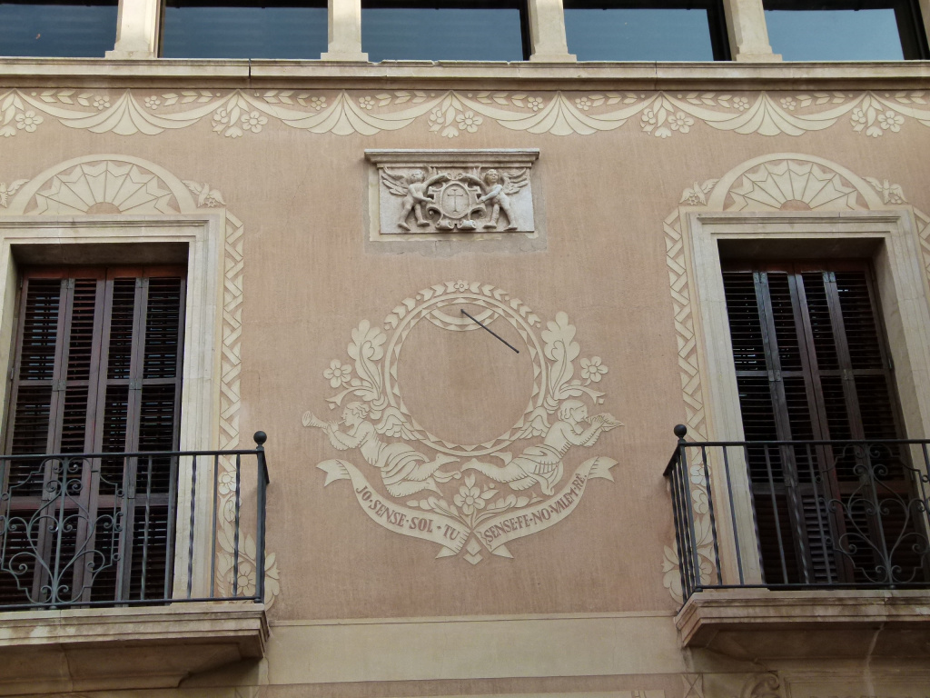 La decoració del rellotge és de tipus vegetal i floral, destaquen dos angelets, el de l’esquerra està bufant un corn i el de la dreta un cargol de mar. A sota, hi ha la inscripció del lema: "Jo sense sol / tu sense fe / no valem res", dins d’una banda dividida en dues parts per una flor de cinc pètals.
