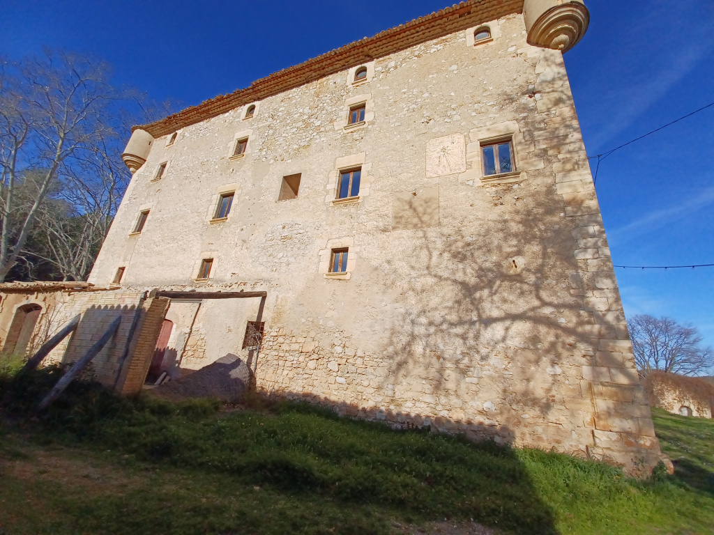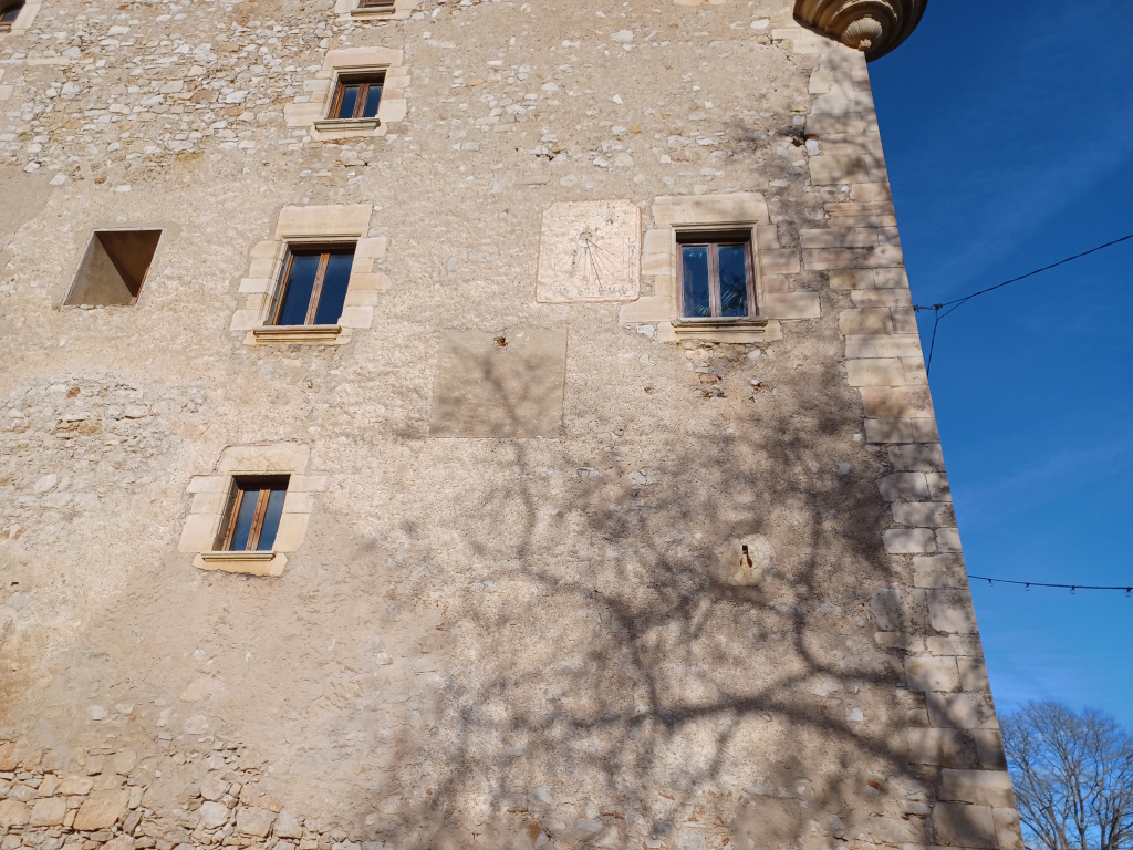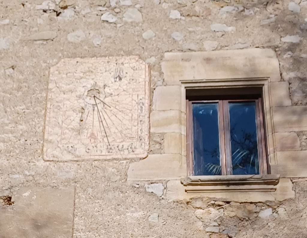Rellotge de sol situat a la façana sud del Mas Pontons, al costat d’una de les finestres del primer pis.