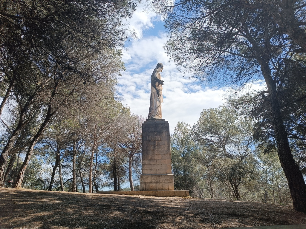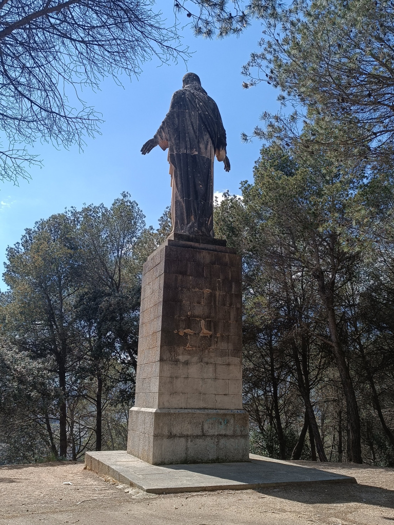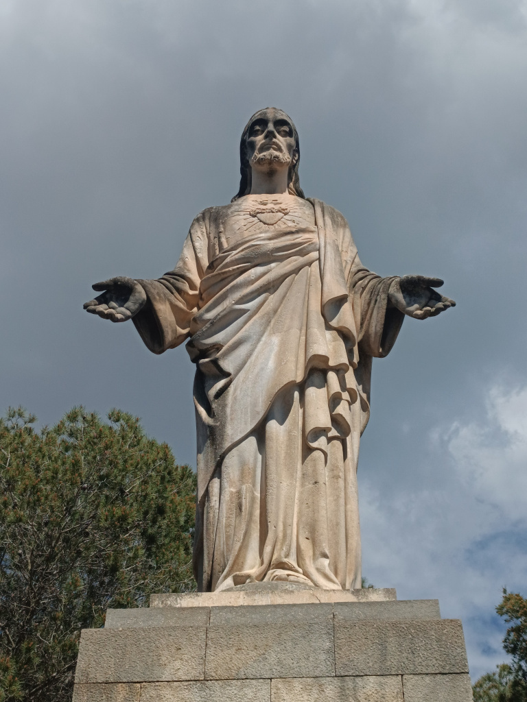 El pedestal serveix de suport per a una estàtua de Jesucrist, que es representa vestit amb una túnica, els braços oberts i el Sagrat Cor al pit. Aquesta imatge cristiana simbolitza el cor de Jesucrist i representa el seu amor i sacrifici per la humanitat; està coronat d’espines i envoltat de flames com a símbol del seu patiment i amb una creu que recorda la seva mort per salvar la humanitat.