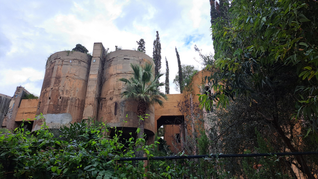 Els jardins, que envolten l’edifici, contribueixen a crear una atmosfera romàntica, on els murs de formigó desgastats es fonen amb la vegetació exuberant composta per pins i eucaliptus, generant un contrast poètic entre les estructures industrials i l’entorn natural.