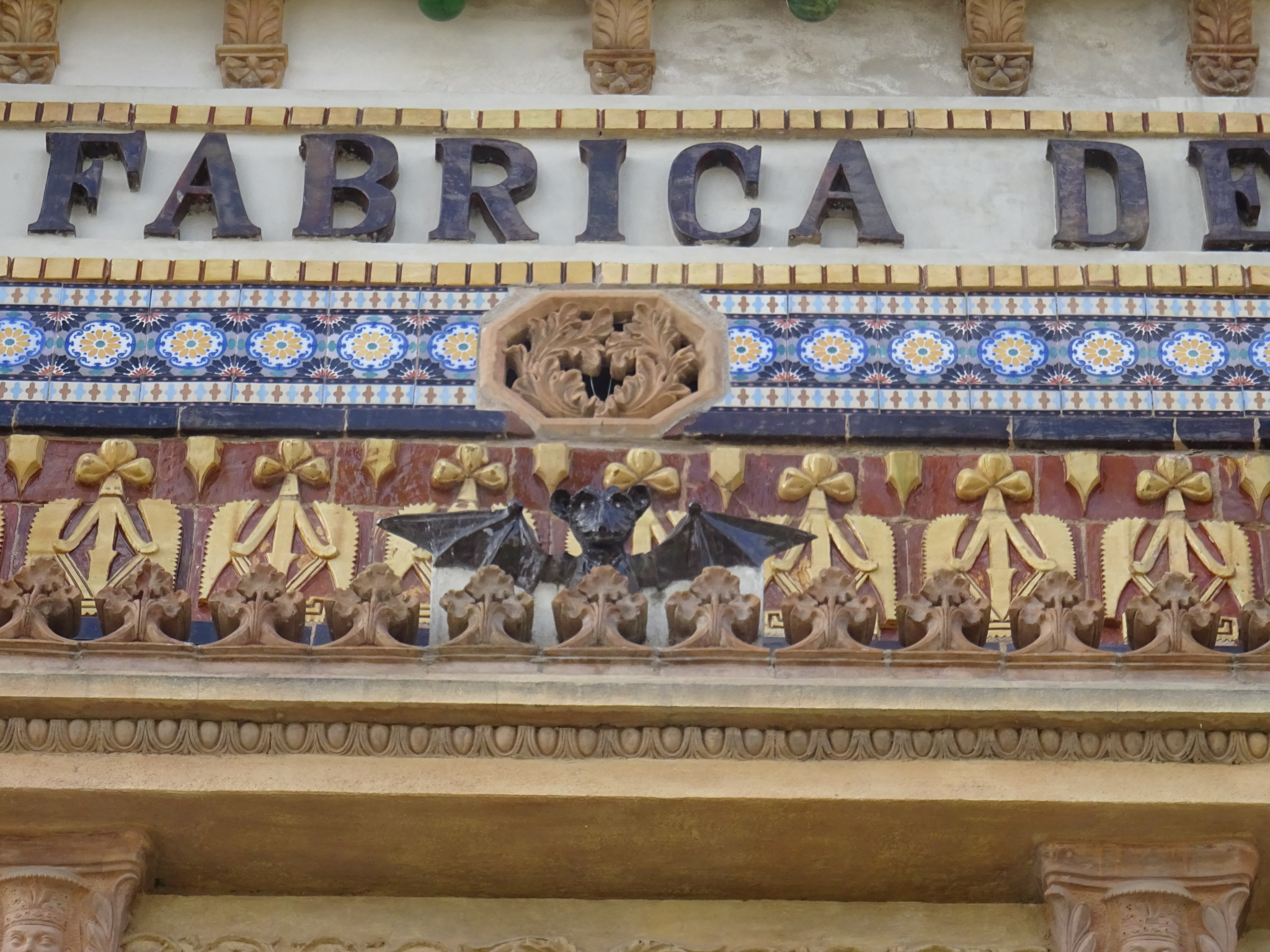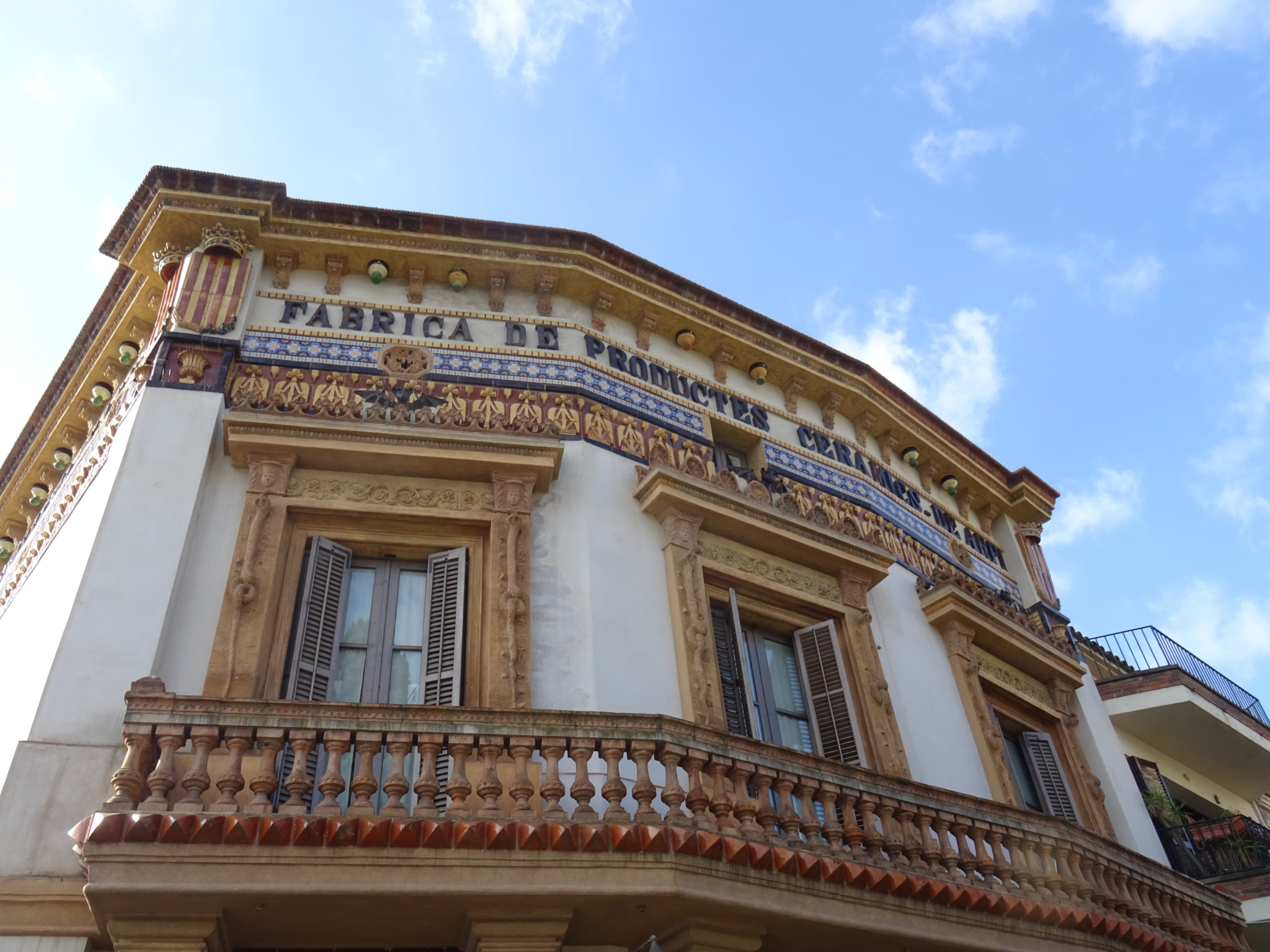 Al primer pis hi trobem un balcó corregut amb balustrada de ceràmica que ocupa tota la façana, amb tres obertures de grans dimensions. Es recolza sobre les mènsules del pis inferior. Sota els balustres hi ha una línia de peces amb frontal piramidal. Les obertures del balcó contenen unes cornises d'estil jònic rematades per corones de trèvols i amb un ratpenat d'ales esteses al capdamunt. En l'emmarcament de les obertures hi ha diversos elements ornaments en relleu, com ara serps, màscares, fulles de palmeta, sarments i grotescos.