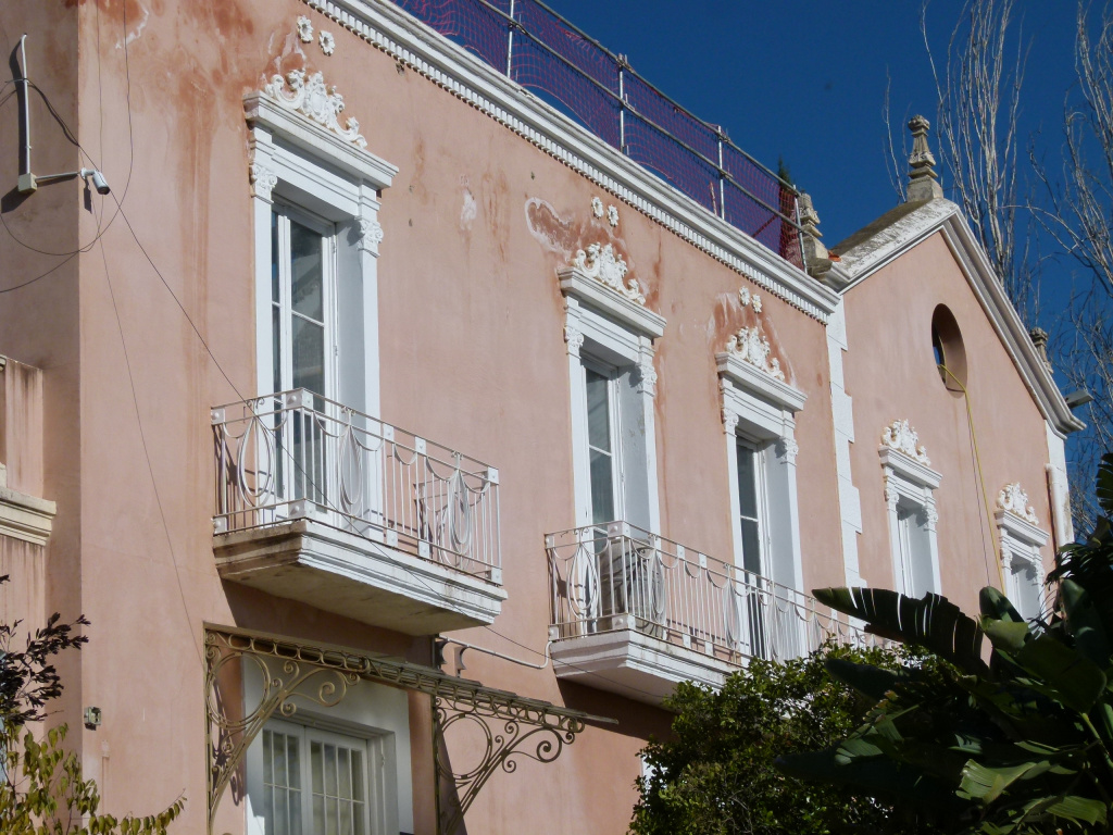 La cornisa és de relleu triple i té un perfil escalonat al centre, que afegeix interès visual a la línia de la façana. L’exterior està decorat amb jardineres i elements vegetals que complementen el to rosat de l’edifici, amb dos xiprers flanquejant l’entrada principal.