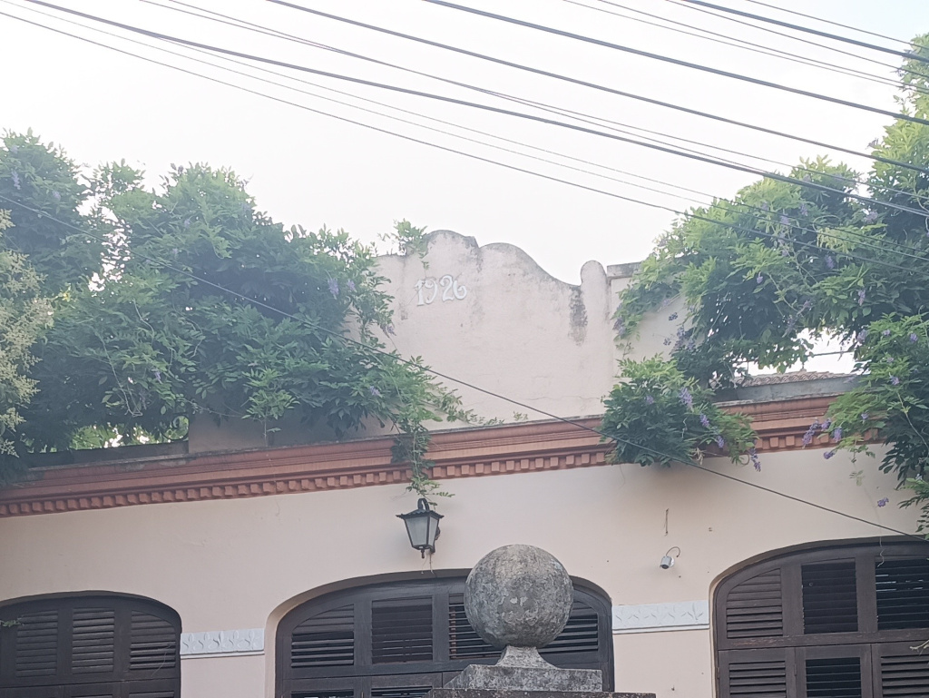 La façana presenta una composició simètrica amb tres grans obertures d’arc rebaixat, la central de les quals correspon a la porta d’accés. Les obertures conserven la fusteria original i persianes de llibret. Per damunt de la línia de llindes, una cornisa motllurada delimita la part superior del mur, sobre la qual s’aixeca un coronament central de perfil rectangular, on s’hi pot llegir la data “1926”, possiblement referida a l’any de construcció de l’edifici.