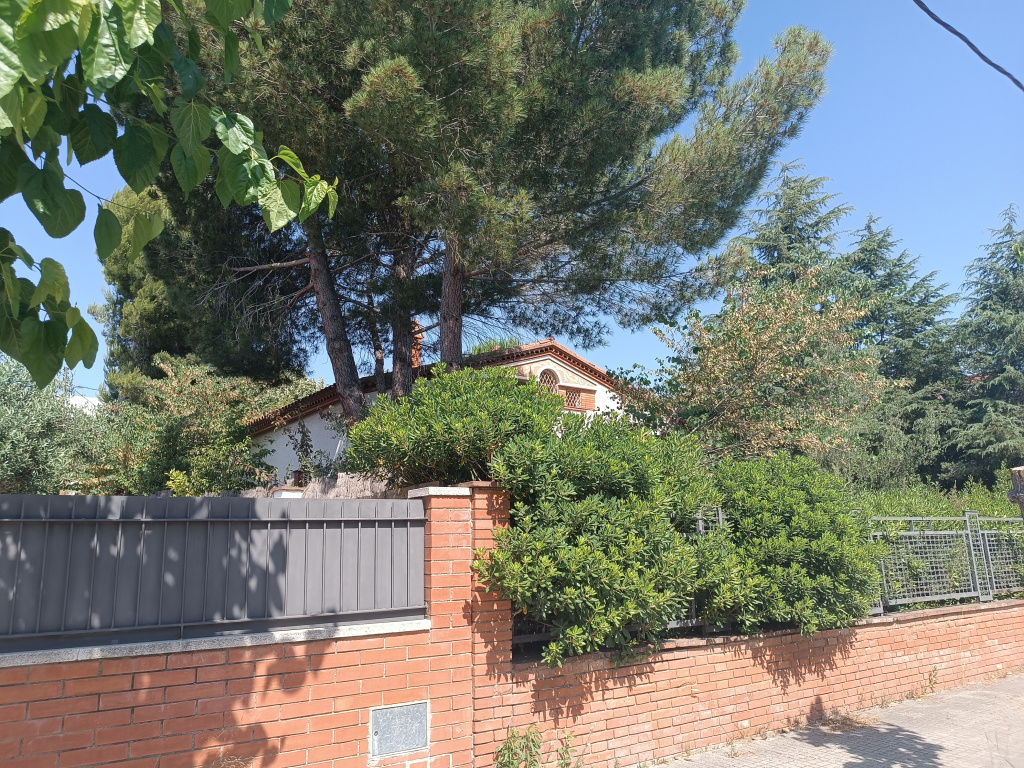 L’acabat de la façana combina l’estucat de tons clars amb elements de maó vist, com llindes i brancals, i una coberta de teula àrab de color vermellós. L’edifici es troba envoltat per jardí i delimitat per una tanca amb sòcol de maó i elements metàl·lics a la part superior.