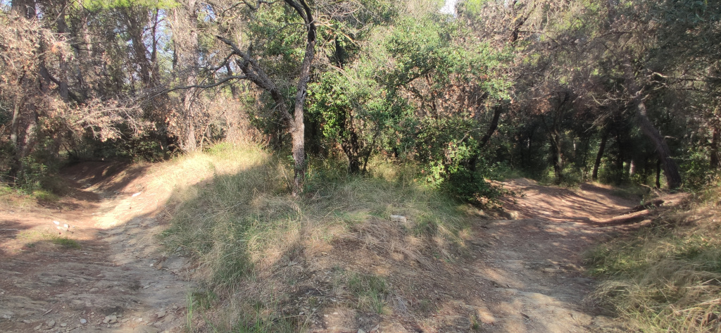 Camí forestal amb un tram diferent de la traça antiga del camí històric a l'ermita de la Salut per can Coscoll. El traçat històric continua, força desdibuixat, però identificat al cadastre, mentre que el nou traçat per la part nord és el més emprat actualment.