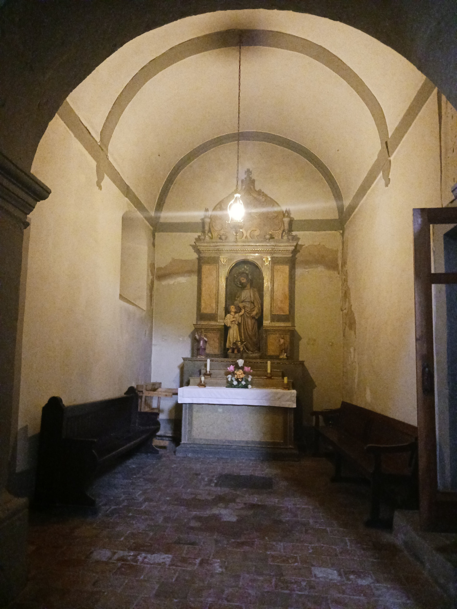 A la part nord-est de l'església i coincidint amb el que seria la capçalera de la nau nord de l'església de Sant Quirze entre l'espai del presbiteri hi ha una petita capella dedicada a Sant Josep. Es tracta d'un espai de planta rectangular allargassada situat de forma paral·lela a la paret nord del presbiteri i comunicat mitjançant una porta o pas obert a la paret sud de la mateixa. Aquest espai està cobert amb una volta de canó de mig punt i les parets que la sostenen tenen una amplada considerable. A més a mes a la part nord-est i a tocar amb la cantonada hi ha oberta una finestra d'arc de mig punt i de doble esqueixada que recorda molt la tipologia de les finestres romàniques o fins hi tot pre romàniques de moltes esglésies tenint en compte que l'origen de l'església seria de mitjans del segle IX i X. A més al paviment format per toves ceràmiques en forma de cairó hi ha encara els vestigis d'una lauda sepulcral d'un enterrament familiar on hi ha la representació d'un crani i d'una calavera. Val a dir que la connexió amb la nau neoclàssic es fa mitjançant un arc former descentrat respecte l'antiga nau medieval i comunicat de manera forçada amb el cos de la nova església fet que permet interpretar que corresponen a períodes i fases diferents ja que si haguessin estat fets en el mateix moment estaria completament centrat cosa que no és el cas. A més a més damunt del pas de comunicació amb el cos del presbiteri de l'absis principal hi ha encastat en el gruix de la paret un armari per a les relíquies i objectes litúrgics i tancat per una porta de fusta amb tres claus i amb els golfos o tancadures de ferro forjat. Aquest element recorda a altres conservats en molts monestirs catalans com a ara a Santa Maria d'Alaó a l'Aragó o santa Maria d'Arles (Arles Sur tec al Rosselló francès) o a l'església de Santa Maria de Palau de Rialb a la Noguera i dins el municipi de la Baronia de Rialb. Altres vestigis medievals de l'antiga església en seria el mur nord de la nau neoclàssica que tanca la capella de la Verge de Montserrat i que presenta un determinat desplom que no és degut a la volta moderna sinó a una antiga volta desapareguda com a ampliació de la nau primitiva. Val a dir que és en aquest punt on hi ha oberta l'antiga porta d'entrada a l'església, visible des de la part externa, fet que permet reforçar aquesta hipòtesi.