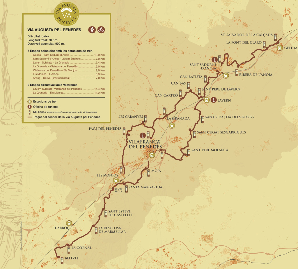 La Via Augusta del Penedès és un projecte que ha recreat el recorregut de la Via Augusta a través de les comarques del Baix i Alt Penedès, transformant-la en una ruta de descobriment del territori. Aquest itinerari està estructurat en 7 etapes principals amb 2 variants addicionals, totes de baixa dificultat, amb distàncies entre 6 i 12 km i sense desnivells significatius. El trajecte, que pot ser recorregut en qualsevol direcció, està dissenyat per ser realitzat tant a peu com en bicicleta. Connectant aquests segments, els usuaris poden explorar longitudinalment l'espina dorsal de la comarca del Penedès, proporcionant una experiència integral del paisatge i la cultura locals.