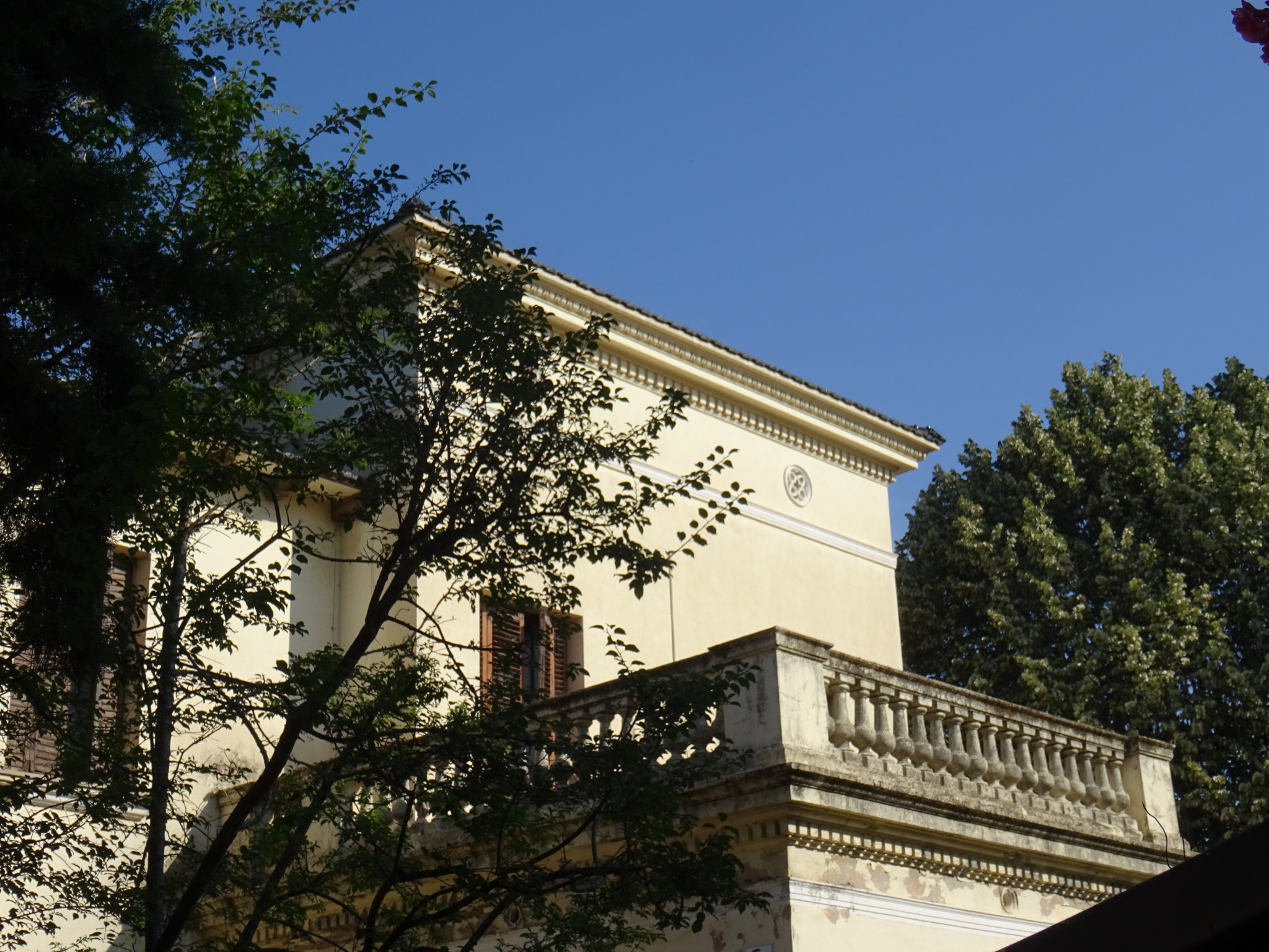 El cancell de la tanca exterior està emmarcat per pilars rematats amb una cornisa jònica. Al jardí hi ha un til·ler.
