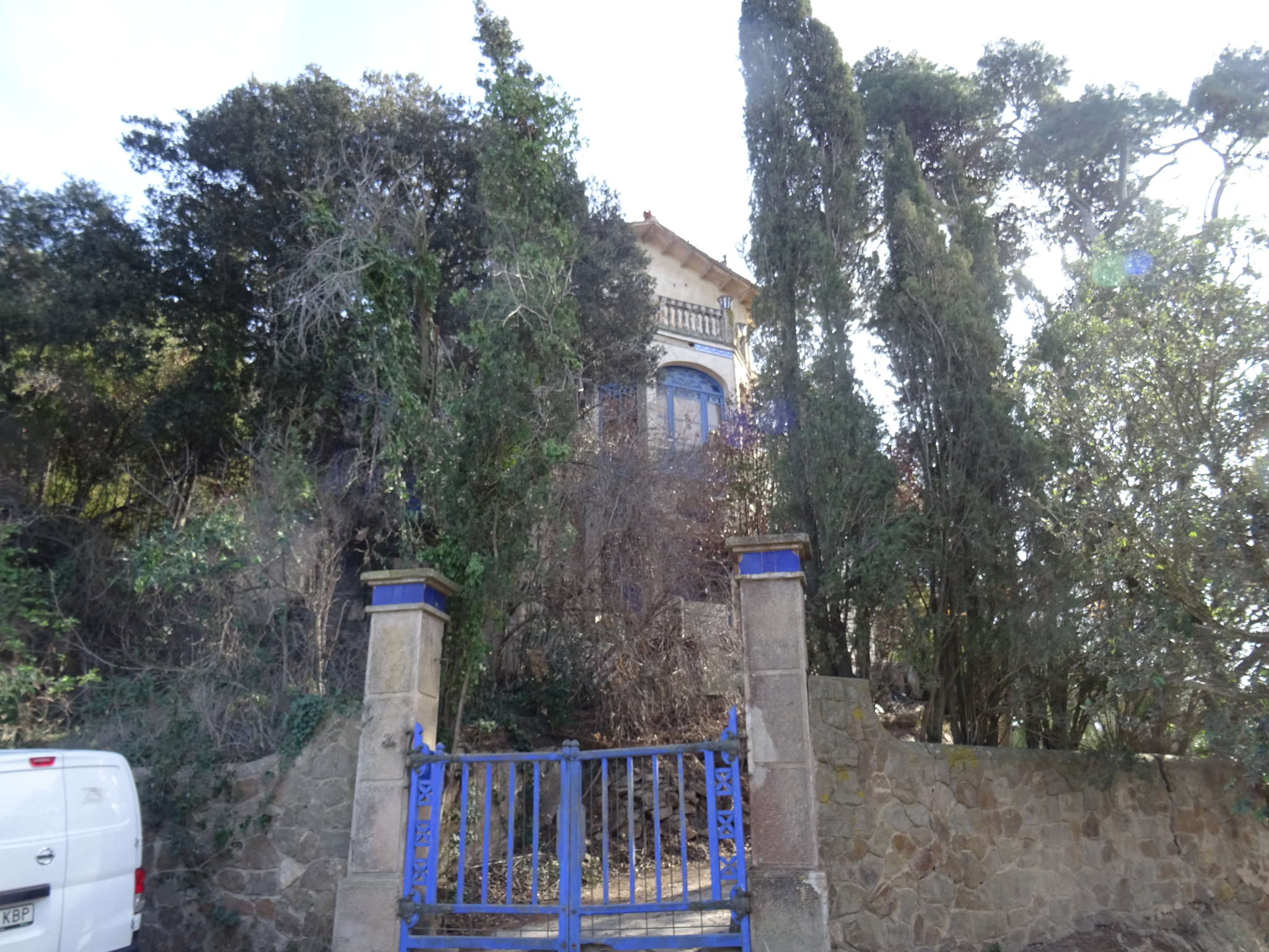 El cancell de la finca és format per dues pilastres de base quadrada amb pedra escairada i acabat rugós. El remat és fet amb un fris classicista i una franja de ceràmica blava. El portal és de fusta pintada de blau. En destaquen les frontisses d'estil modernista.