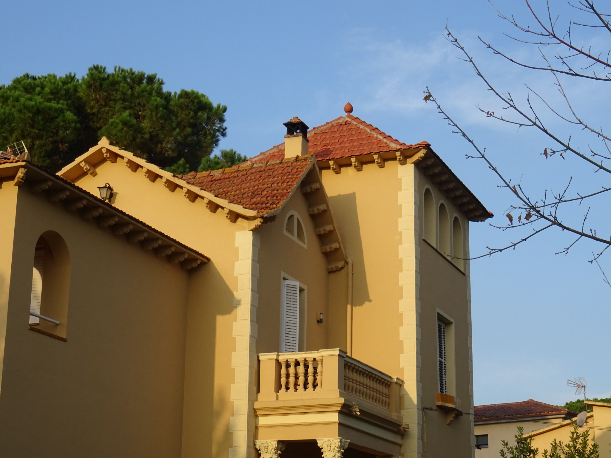 Tots els murs estan arrebossats, i els angles presenten estucat imitant carreus. Les obertures estan emfatitzades amb una banda pintada al seu contorn. Coronament de l'edifici es resol mitjançant un ràfec amb caps de biga de fusta.