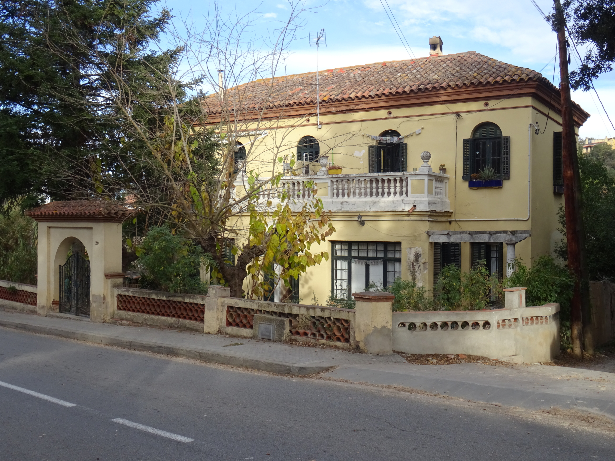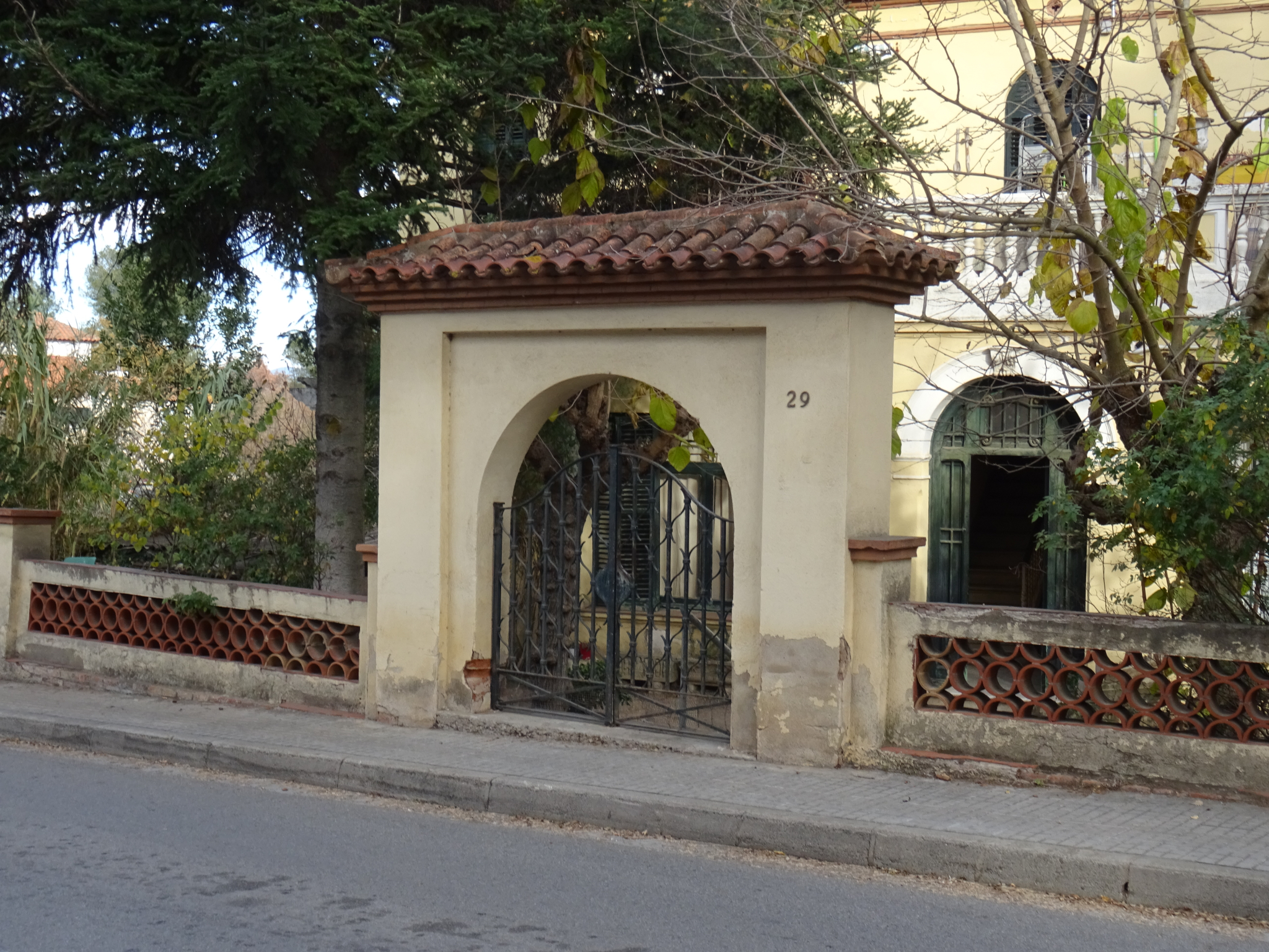 La tanca de la finca està arrebossada i conté una gelosia de peces de ceràmica circular i semicircular. El cancell és d'obra, amb un arc de punt rodó coronat per una teuladeta amb ràfec de maó.