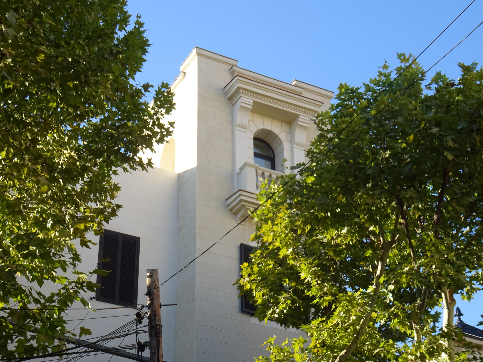 El cos en forma de torre mirador sobresurt amb un pis més que la resta de l'edifici. A la planta superior té a cada cara un balcó amb balustrada de peces de morter modelat. Cadascun queda aixoplugat sota una prominent cornisa, sostinguda per unes mènsules i llindes d'estil classicista. A les parets de la torre hi ha un plafó amb relleus escultòrics que representen una dansa pagana, així com una orla amb un escut de mosaic blau, on hi havia un dibuix actualment perdut.