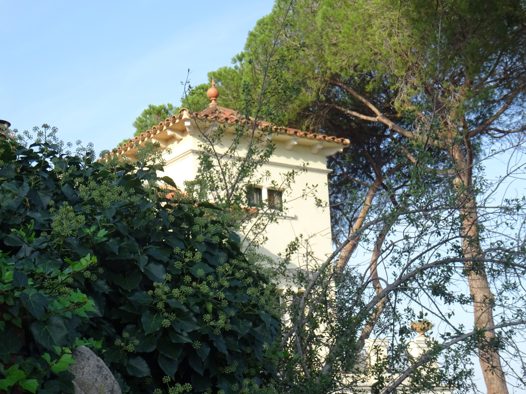 El coronament del cos de l'esquerra és format per un davantal sortint que trenca la teulada, que és a dues aigües. En la torre el coronament consta d'una cornisa i un ràfec amb caps de biga, i la teulada és a quatre vessants, culminada amb una bola ceràmica.