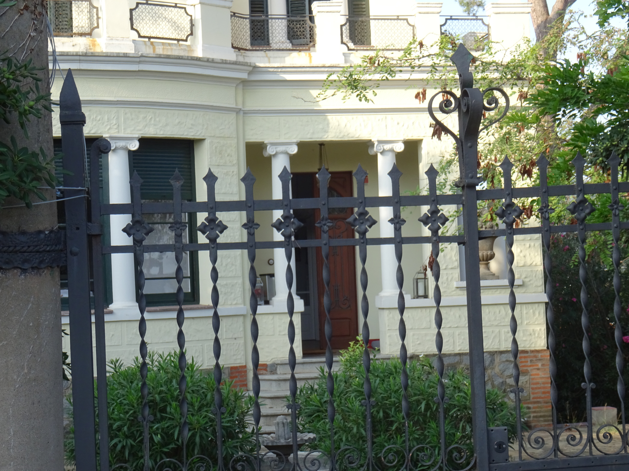 La façana principal presenta un cos central i, a la dreta, la torre. A la planta baixa el cos central es caracteritza per una galeria tancada, amb finestrals separats per unes columnes jòniques. Al cos de la dreta hi ha un porxo, també amb columnes d'ordre jònic, sota el qual hi ha la porta d'entrada. Al primer pis sobre la galeria i el porxo hi trobem unes terrasses amb baranes de ferro entre pilastrons d'estil classicista. En el cos de l'esquerra una porta dona accés a aquesta terrassa. És emfasitzada amb una faixa engaltada. Al cos de la torre, a la dreta, hi ha una triple finestra que conté dues columnes d'ordre dòric, rematada amb una cornisa. Al pis superior la torre conté dues finestretes, emfatitzades a l'ampit.