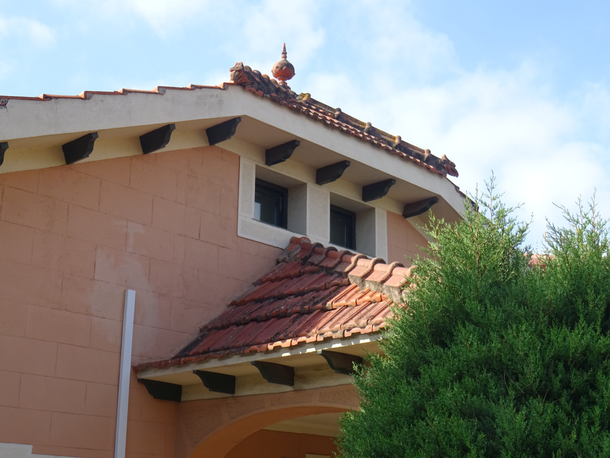 La façana principal presenta una composició simètrica en base a tres obertures a la planta baixa. Al centre hi ha el portal d'entrada, aixoplugat amb un pòrtic proporcionalment força gran, fet amb arcs rebaixats i subjectat per columnes toscanes. La teuladeta del pòrtic és a tres vessants i amb caps de biga de fusta a la part inferior. Al nivell de les golfes a la façana hi ha dues finestres sobre l'eix central. Totes les obertures són emmarcades amb unes bandes estucades i granulades que imiten els carreus, també en els angles de l'edifici. El ràfec conté caps de biga de fusta, i la teulada és truncada. Al vèrtex queda rematada per una bola.
