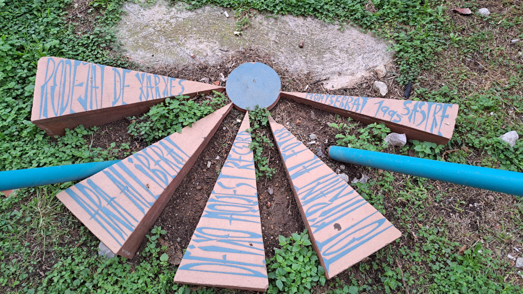 A la base del creixement de dos dels pilars blaus que suporten aquestes xarxes, hi ha unes peces triangulars en les quals hi ha escrit en lletres blaves uns versos de l'artista Montserrat Sastre, amb els quals expressa sentiments de memòria, alliberament i connexió amb el futur: